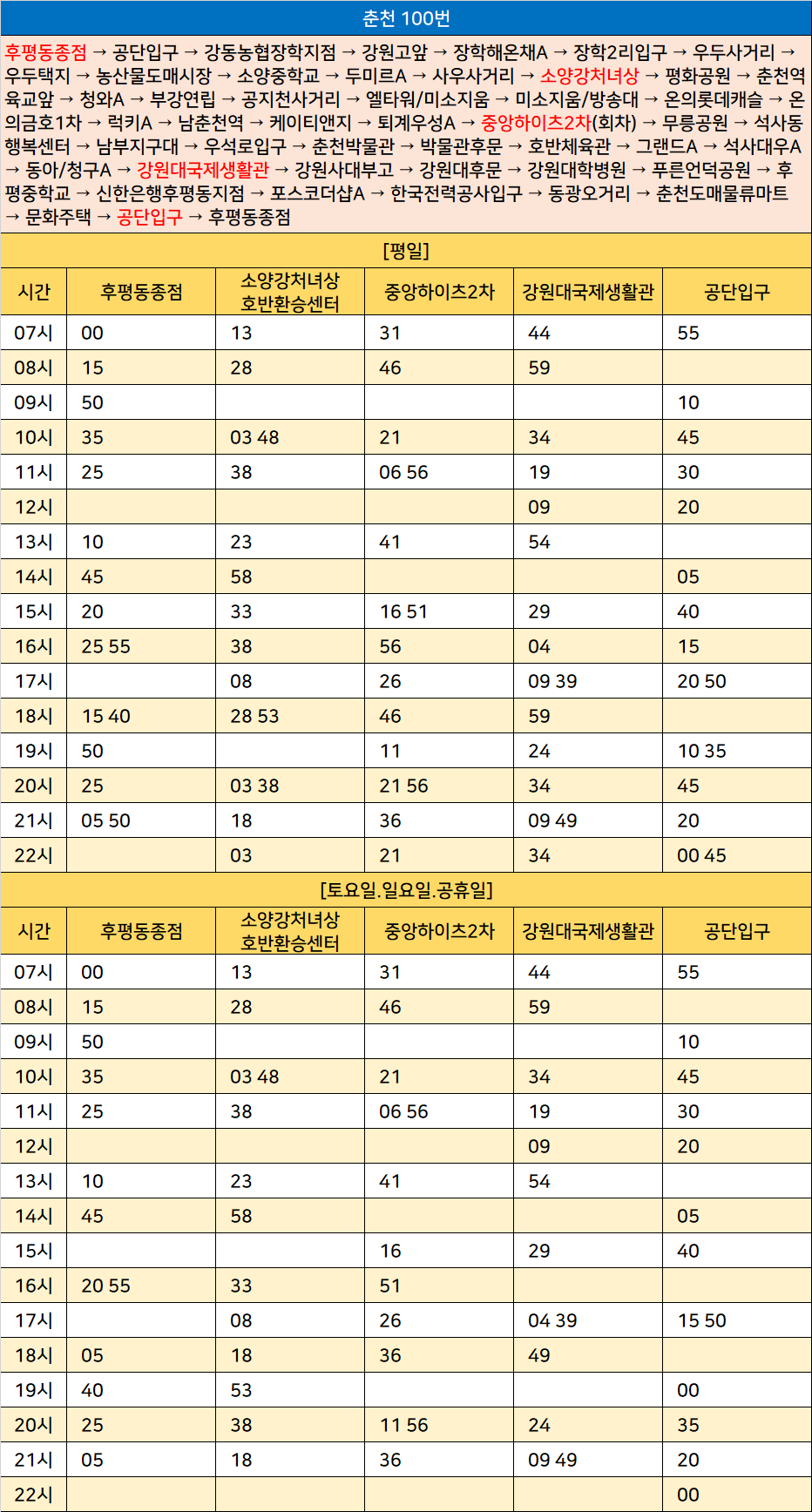 춘천 100번: 후평동종점 → 공단입구 → 강동농협장학지점 → 강원고앞 → 장학해온채A → 장학2리입구 → 우두사거리 → 우두택지 → 농산물도매시장 → 소양중학교 → 두미르A → 사우사거리 → 소양강처녀상 → 평화공원 → 춘천역육교앞 → 청와A → 부강연립 → 공지천사거리 → 엘타워/미소지움 → 미소지움/방송대 → 온의롯데캐슬 → 온의금호1차 → 럭키A → 남춘천역 → 케이티앤지 → 퇴계우성A → 중앙하이츠2차(회차) → 무릉공원 → 석사동행복센터 → 남부지구대 → 우석로입구 → 춘천박물관 → 박물관후문 → 호반체육관 → 그랜드A → 석사대우A → 동아/청구A → 강원대국제생활관 → 강원사대부고 → 강원대후문 → 강원대학병원 → 푸른언덕공원 → 후평중학교 → 신한은행후평동지점 → 포스코더샵A → 한국전력공사입구 → 동광오거리 → 춘천도매물류마트 → 문화주택 → 공단입구 → 후평동종점