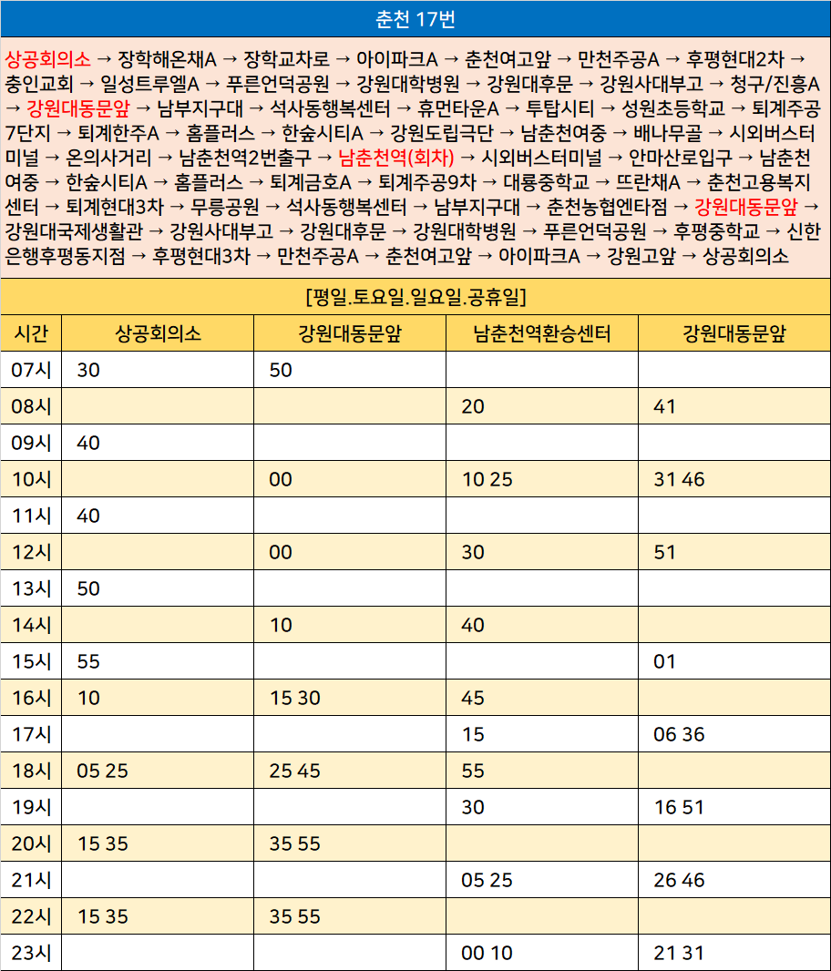 춘천 17번: 상공회의소 → 장학해온채A → 장학교차로 → 아이파크A → 춘천여고앞 → 만천주공A → 후평현대2차 → 충인교회 → 일성트루엘A → 푸른언덕공원 → 강원대학병원 → 강원대후문 → 강원사대부고 → 청구/진흥A → 강원대동문앞 → 남부지구대 → 석사동행복센터 → 휴먼타운A → 투탑시티 → 성원초등학교 → 퇴계주공7단지 → 퇴계한주A → 홈플러스 → 한숲시티A → 강원도립극단 → 남춘천여중 → 배나무골 → 시외버스터미널 → 온의사거리 → 남춘천역2번출구 → 남춘천역(회차) → 시외버스터미널 → 안마산로입구 → 남춘천여중 → 한숲시티A → 홈플러스 → 퇴계금호A → 퇴계주공9차 → 대룡중학교 → 뜨란채A → 춘천고용복지센터 → 퇴계현대3차 → 무릉공원 → 석사동행복센터 → 남부지구대 → 춘천농협엔타점 → 강원대동문앞 → 강원대국제생활관 → 강원사대부고 → 강원대후문 → 강원대학병원 → 푸른언덕공원 → 후평중학교 → 신한은행후평동지점 → 후평현대3차 → 만천주공A → 춘천여고앞 → 아이파크A → 강원고앞 → 상공회의소