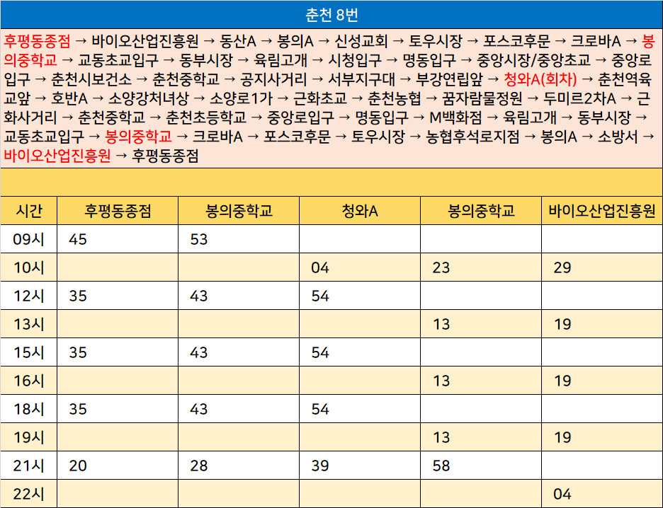 춘천 8번: 후평동종점 → 바이오산업진흥원 → 동산A → 봉의A → 신성교회 → 토우시장 → 포스코후문 → 크로바A → 봉의중학교 → 교동초교입구 → 동부시장 → 육림고개 → 시청입구 → 명동입구 → 중앙시장/중앙초교 → 중앙로입구 → 춘천시보건소 → 춘천중학교 → 공지사거리 → 서부지구대 → 부강연립앞 → 청와A(회차) → 춘천역육교앞 → 호반A → 소양강처녀상 → 소양로1가 → 근화초교 → 춘천농협 → 꿈자람물정원 → 두미르2차A → 근화사거리 → 춘천중학교 → 춘천초등학교 → 중앙로입구 → 명동입구 → M백화점 → 육림고개 → 동부시장 → 교동초교입구 → 봉의중학교 → 크로바A → 포스코후문 → 토우시장 → 농협후석로지점 → 봉의A → 소방서 → 바이오산업진흥원 → 후평동종점
