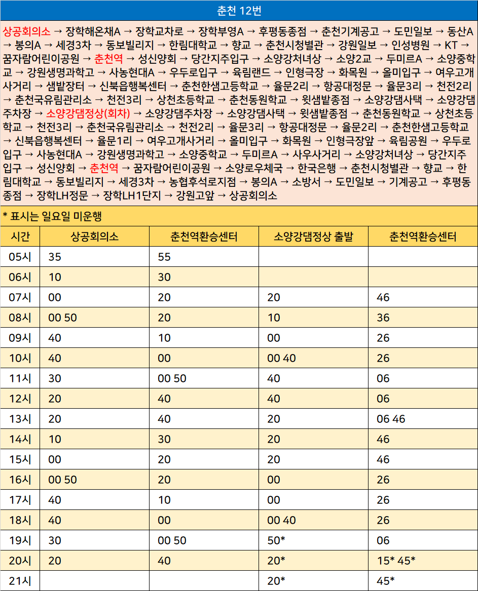춘천 12번: 상공회의소 → 장학해온채A → 장학교차로 → 장학부영A → 후평동종점 → 춘천기계공고 → 도민일보 → 동산A → 봉의A → 세경3차 → 동보빌리지 → 한림대학교 → 향교 → 춘천시청별관 → 강원일보 → 인성병원 → KT → 꿈자람어린이공원 → 춘천역 → 성신양회 → 당간지주입구 → 소양강처녀상 → 소양2교 → 두미르A → 소양중학교 → 강원생명과학고 → 사농현대A → 우두로입구 → 육림랜드 → 인형극장 → 화목원 → 올미입구 → 여우고개사거리 → 샘밭장터 → 신북읍행복센터 → 춘천한샘고등학교 → 율문2리 → 항공대정문 → 율문3리 → 천전2리 → 춘천국유림관리소 → 천전3리 → 상천초등학교 → 춘천동원학교 → 윗샘밭종점 → 소양강댐사택 → 소양강댐주차장 → 소양강댐정상(회차) → 소양강댐주차장 → 소양강댐사택 → 윗샘밭종점 → 춘천동원학교 → 상천초등학교 → 천전3리 → 춘천국유림관리소 → 천전2리 → 율문3리 → 항공대정문 → 율문2리 → 춘천한샘고등학교 → 신북읍행복센터 → 율문1리 → 여우고개사거리 → 올미입구 → 화목원 → 인형극장앞 → 육림공원 → 우두로입구 → 사농현대A → 강원생명과학고 → 소양중학교 → 두미르A → 사우사거리 → 소양강처녀상 → 당간지주입구 → 성신양회 → 춘천역 → 꿈자람어린이공원 → 소양로우체국 → 한국은행 → 춘천시청별관 → 향교 → 한림대학교 → 동보빌리지 → 세경3차 → 농협후석로지점 → 봉의A → 소방서 → 도민일보 → 기계공고 → 후평동종점 → 장학LH정문 → 장학LH1단지 → 강원고앞 → 상공회의소