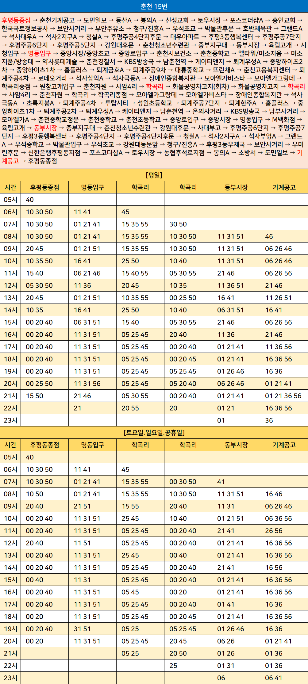춘천 15번: 후평동종점 → 춘천기계공고 → 도민일보 → 동산A → 봉의A → 신성교회 → 토우시장 → 포스코더샵A → 충인교회 → 한국국토정보공사 → 보안사거리 → 부안주유소 → 청구/진흥A → 우석초교 → 박물관후문 → 호반체육관 → 그랜드A → 석사대우A → 석사2지구A → 청실A → 후평주공4단지후문 → 대우아파트 → 후평3동행복센터 → 후평주공7단지 → 후평주공6단지 → 후평주공5단지 → 강원대후문 → 춘천청소년수련관 → 중부지구대 → 동부시장 → 육림고개 → 시청입구 → 명동입구 → 중앙시장/중앙초교 → 중앙로입구 → 춘천시보건소 → 춘천중학교 → 엘타워/미소지움 → 미소지움/방송대 → 약사롯데캐슬 → 춘천경찰서 → KBS방송국 → 남춘천역 → 케이티앤지 → 퇴계우성A → 중앙하이츠2차 → 중앙하이츠1차 → 홈플러스 → 퇴계금호A → 퇴계주공9차 → 대룡중학교 → 뜨란채A → 춘천고용복지센터 → 퇴계주공4차 → 로데오거리 → 석사삼익A → 석사극동A → 장애인종합복지관 → 모아엘가비스타 → 모아엘가그랑데 → 학곡리종점 → 원창고개입구 → 춘천자원 → 사암4리 → 학곡리 → 화물공영차고지(회차) → 화물공영차고지 → 학곡리 → 사암4리 → 춘천자원 → 학곡리 → 학곡리종점 → 모아엘가그랑데 → 모아엘가비스타 → 장애인종합복지관 → 석사극동A → 초록지붕A → 퇴계주공4차 → 투탑시티 → 성원초등학교 → 퇴계주공7단지 → 퇴계한주A → 홈플러스 → 중앙하이츠1차 → 퇴계주공2차 → 퇴계우성A → 케이티앤지 → 남춘천역 → 온의사거리 → KBS방송국 → 남부사거리 → 모아엘가A → 춘천중학교정문 → 춘천중학교 → 춘천초등학교 → 중앙로입구 → 중앙시장 → 명동입구 → M백화점 → 육림고개 → 동부시장 → 중부지구대 → 춘천청소년수련관 → 강원대후문 → 사대부고 → 후평주공6단지 → 후평주공7단지 → 후평3동행복센터 → 후평주공4단지 → 후평주공4단지후문 → 청실A → 석사2지구A → 석사부영A → 그랜드A → 우석중학교 → 박물관입구 → 우석초교 → 강원대동문앞 → 청구/진흥A → 후평3동우체국 → 보안사거리 → 우미린후문 → 신한은행후평동지점 → 포스코더샵A → 토우시장 → 농협후석로지점 → 봉의A → 소방서 → 도민일보 → 기계공고 → 후평동종점