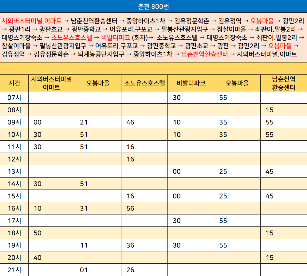 춘천 800번: 시외버스터미널.이마트 → 남춘천역환승센터 → 중앙하이츠1차 → 김유정문학촌 → 김유정역 → 오봉마을 → 광판2리 → 광판1리 → 광판초교 → 광판중학교 → 어유포리.구포교 → 팔봉산관광지입구 → 참살이마을 → 쇠판이.팔봉2리 → 대명스키장숙소 → 소노유스호스텔 → 비발디파크 (회차)→ 소노유스호스텔 → 대명스키장숙소 → 쇠판이.팔봉2리 → 참살이마을 → 팔봉산관광지입구 → 어유포리.구포교 → 광판중학교 → 광판초교 → 광판 → 광판2리 → 오봉마을 → 김유정역 → 김유정문학촌 → 퇴계농공단지입구 → 중앙하이츠1차 → 남춘천역환승센터 → 시외버스터미널.이마트