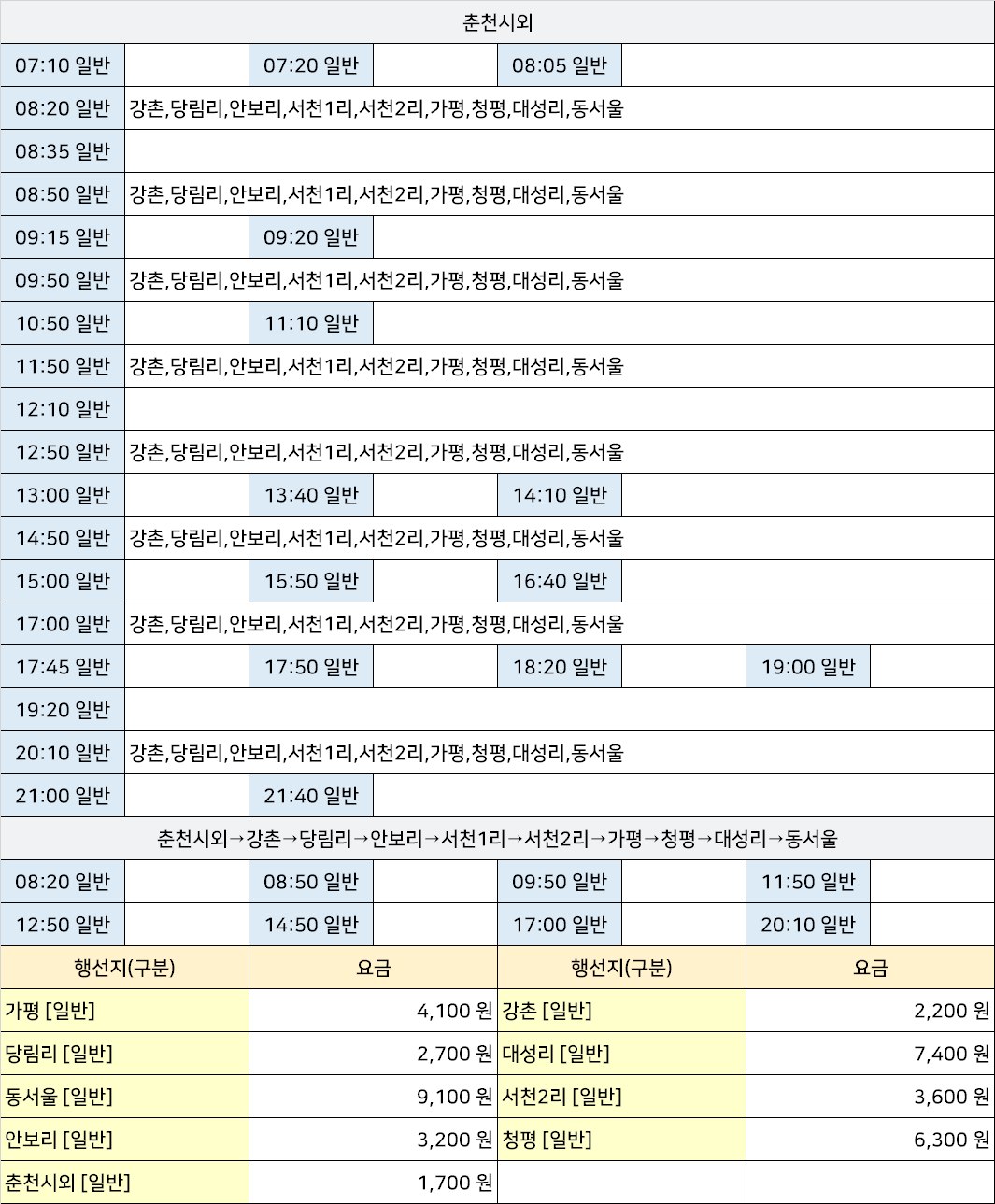 춘천역환승센터시외고속버스터미널 춘천역환승정류장 춘천역환승정류소 → "춘천시외→강촌→당림리→안보리→서천1리→서천2리→가평→청평→대성리→동서울".