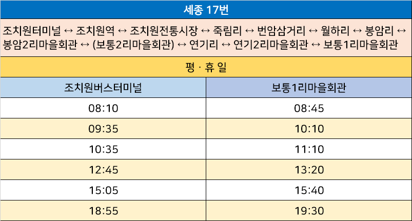 세종 17번: 조치원터미널 ↔ 조치원역 ↔ 조치원전통시장 ↔ 죽림리 ↔ 번암삼거리 ↔ 월하리 ↔ 봉암리 ↔ 봉암2리마을회관 ↔ (보통2리마을회관) ↔ 연기리 ↔ 연기2리마을회관 ↔ 보통1리마을회관