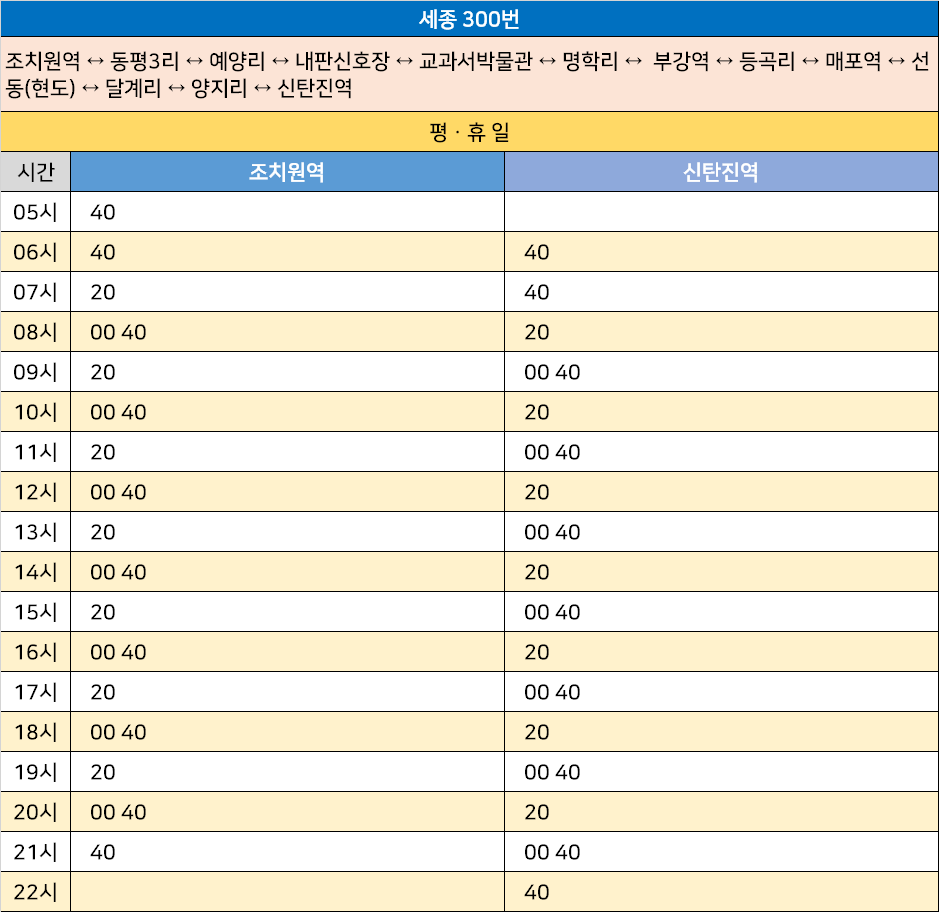 세종 300번: 조치원역 ↔ 동평3리 ↔ 예양리 ↔ 내판신호장 ↔ 교과서박물관 ↔ 명학리 ↔  부강역 ↔ 등곡리 ↔ 매포역 ↔ 선동(현도) ↔ 달계리 ↔ 양지리 ↔ 신탄진역