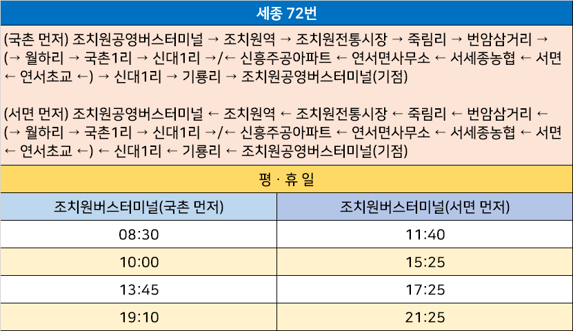 세종 72번: (국촌 먼저) 조치원공영버스터미널 → 조치원역 → 조치원전통시장 → 죽림리 → 번암삼거리 → (→ 월하리 → 국촌1리 → 신대1리 →/← 신흥주공아파트 ← 연서면사무소 ← 서세종농협 ← 서면 ← 연서초교 ←) → 신대1리 → 기룡리 → 조치원공영버스터미널(기점) / (서면 먼저) 조치원공영버스터미널 ← 조치원역 ← 조치원전통시장 ← 죽림리 ← 번암삼거리 ← (→ 월하리 → 국촌1리 → 신대1리 →/← 신흥주공아파트 ← 연서면사무소 ← 서세종농협 ← 서면 ← 연서초교 ←) ← 신대1리 ← 기룡리 ← 조치원공영버스터미널(기점)