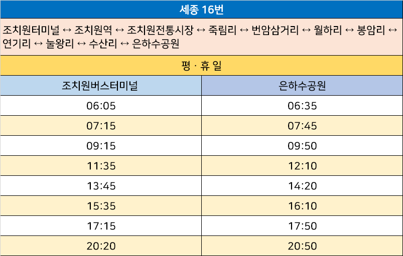 세종 16번: 조치원터미널 ↔ 조치원역 ↔ 조치원전통시장 ↔ 죽림리 ↔ 번암삼거리 ↔ 월하리 ↔ 봉암리 ↔ 연기리 ↔ 눌왕리 ↔ 수산리 ↔ 은하수공원