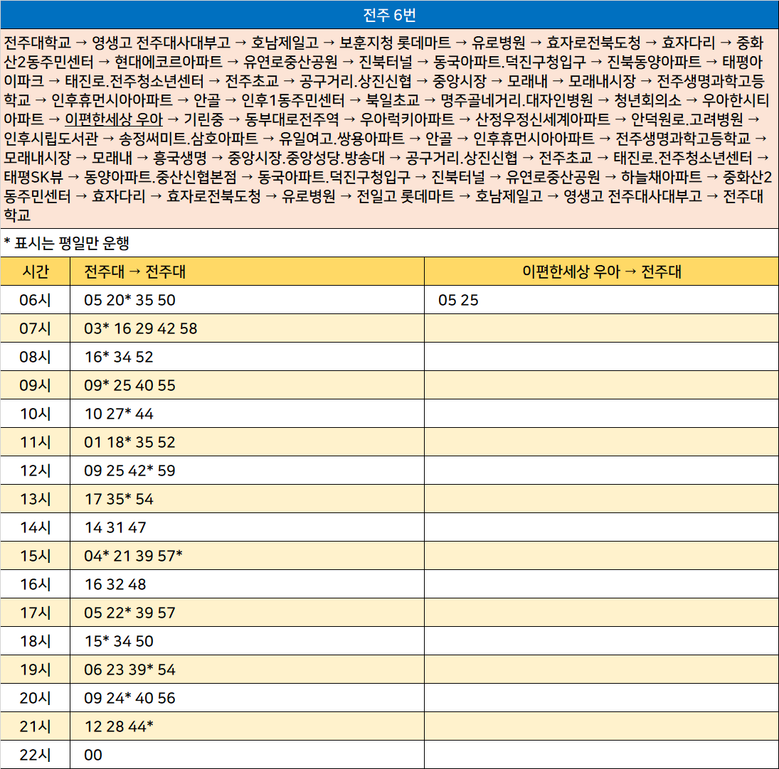 전주 6번: 전주대 → 영생고 전주대사대부고 → 호남제일고 → 보훈지청 롯데마트 → 유로병원 → 효자로전북도청 → 효자다리 → 중화산2동주민센터 → 현대에코르A → 유연로중산공원 → 진북터널 → 동국A.덕진구청 → 진북동양A → 태평아이파크 → 태진로.전주청소년센터 → 전주초교 → 공구거리.상진신협 → 중앙시장 → 모래내 → 모래내시장 → 전주생명과학고등 → 인후휴먼시아A → 안골 → 인후1동주민센터 → 북일초교 → 명주골네거리.대자인병원 → 청년회의소 → 우아한시티A → 이편한세상 우아 → 기린중 → 동부대로전주역 → 우아럭키A → 산정우정신세계A → 안덕원로.고려병원 → 인후시립도서관 → 송정써미트.삼호A → 유일여고.쌍용A → 안골 → 인후휴먼시아A → 전주생명과학고등 → 모래내시장 → 모래내 → 흥국생명 → 중앙시장.중앙성당.방송대 → 공구거리.상진신협 → 전주초교 → 태진로.전주청소년센터 → 태평SK뷰 → 동양A.중산신협본점 → 동국A.덕진구청 → 진북터널 → 유연로중산공원 → 하늘채A → 중화산2동주민센터 → 효자다리 → 효자로전북도청 → 유로병원 → 전일고 롯데마트 → 호남제일고 → 영생고 전주대사대부고 → 전주대