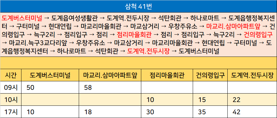 삼척 41번: 도계버스터미널 → 도계읍여성생활관 → 도계역.전두시장 → 석탄회관 → 하나로마트 → 도계읍행정복지센터 → 구터미널 → 현대연립 → 마교리마을회관 → 마교삼거리 → 우창주유소 → 마교리.삼마아파트앞 → 건의령입구 → 늑구2리 → 점리입구 → 점리 → 점리마을회관 → 점리 → 점리입구 → 늑구2리 → 건의령입구 → 마교리.늑구3교다리앞 → 우창주유소 → 마교삼거리 → 마교리마을회관 → 현대연립 → 구터미널 → 도계읍행정복지센터 → 하나로마트 → 석탄회관 → 도계역.전두시장 → 도계버스터미널
