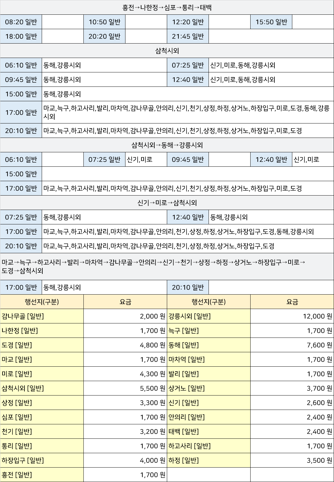 도계시외고속버스터미널 도계정류장 도계정류소 → "마교→늑구→하고사리→발리→마차역→감나무골→안의리→신기→천기→상정→하정→상거노→하장입구→미로→도경→삼척시외,삼척시외→동해→강릉시외,신기→미로→삼척시외,흥전→나한정→심포→통리→태백".