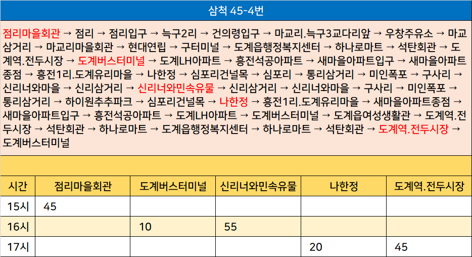 삼척 45-4번: 점리마을회관 → 점리 → 점리입구 → 늑구2리 → 건의령입구 → 마교리.늑구3교다리앞 → 우창주유소 → 마교삼거리 → 마교리마을회관 → 현대연립 → 구터미널 → 도계읍행정복지센터 → 하나로마트 → 석탄회관 → 도계역.전두시장 → 도계버스터미널 → 도계LH아파트 → 흥전석공아파트 → 새마을아파트입구 → 새마을아파트종점 → 흥전1리.도계유리마을 → 나한정 → 심포리건널목 → 심포리 → 통리삼거리 → 미인폭포 → 구사리 → 신리너와마을 → 신리삼거리 → 신리너와민속유물 → 신리삼거리 → 신리너와마을 → 구사리 → 미인폭포 → 통리삼거리 → 하이원추추파크 → 심포리건널목 → 나한정 → 흥전1리.도계유리마을 → 새마을아파트종점 → 새마을아파트입구 → 흥전석공아파트 → 도계LH아파트 → 도계버스터미널 → 도계읍여성생활관 → 도계역.전두시장 → 석탄회관 → 하나로마트 → 도계읍행정복지센터 → 하나로마트 → 석탄회관 → 도계역.전두시장 → 도계버스터미널