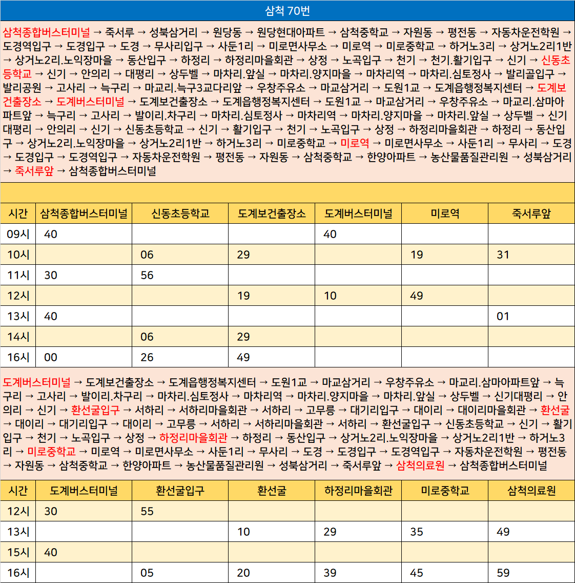도계버스터미널 → 도계보건출장소 → 도계읍행정복지센터 → 도원1교 → 마교삼거리 → 우창주유소 → 마교리.삼마아파트앞 → 늑구리 → 고사리 → 발이리.차구리 → 마차리.심토정사 → 마차리역 → 마차리.양지마을 → 마차리.앞실 → 상두벨 → 신기대평리 → 안의리 → 신기 → 환선굴입구 → 서하리 → 서하리마을회관 → 서하리 → 고무릉 → 대기리입구 → 대이리 → 대이리마을회관 → 환선굴 → 대이리 → 대기리입구 → 대이리 → 고무릉 → 서하리 → 서하리마을회관 → 서하리 → 환선굴입구 → 신동초등학교 → 신기 → 활기입구 → 천기 → 노곡입구 → 상정 → 하정리마을회관 → 하정리 → 동산입구 → 상거노2리.노익장마을 → 상거노2리1반 → 하거노3리 → 미로중학교 → 미로역 → 미로면사무소 → 사둔1리 → 무사리 → 도경 → 도경입구 → 도경역입구 → 자동차운전학원 → 평전동 → 자원동 → 삼척중학교 → 한양아파트 → 농산물품질관리원 → 성북삼거리 → 죽서루앞 → 삼척의료원 → 삼척종합버스터미널