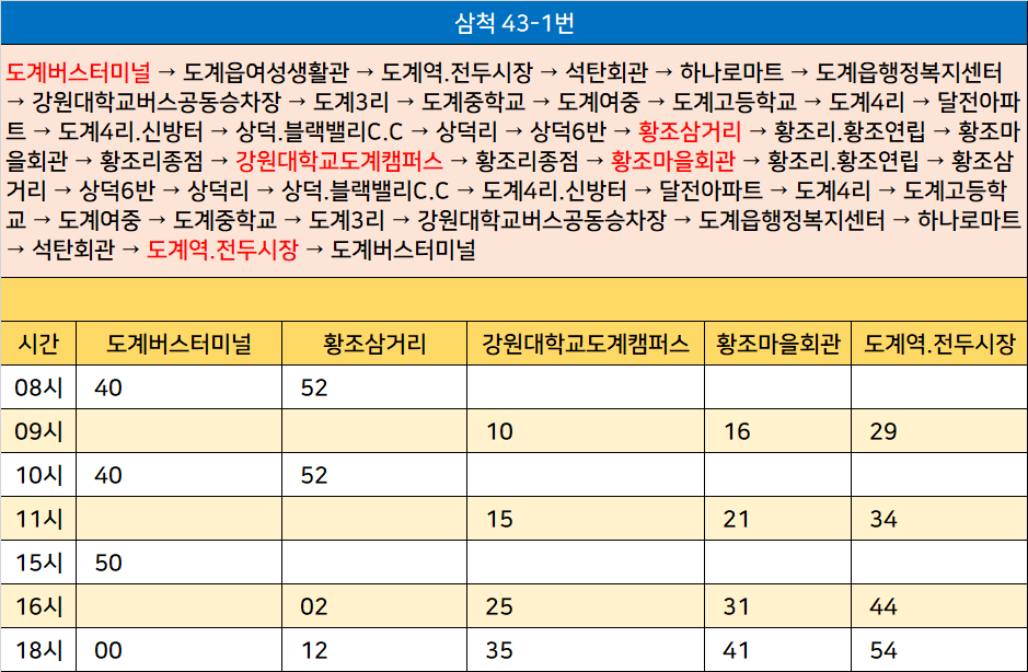 삼척 43-1번: 도계버스터미널 → 도계읍여성생활관 → 도계역.전두시장 → 석탄회관 → 하나로마트 → 도계읍행정복지센터 → 강원대학교버스공동승차장 → 도계3리 → 도계중학교 → 도계여중 → 도계고등학교 → 도계4리 → 달전아파트 → 도계4리.신방터 → 상덕.블랙밸리C.C → 상덕리 → 상덕6반 → 황조삼거리 → 황조리.황조연립 → 황조마을회관 → 황조리종점 → 강원대학교도계캠퍼스 → 황조리종점 → 황조마을회관 → 황조리.황조연립 → 황조삼거리 → 상덕6반 → 상덕리 → 상덕.블랙밸리C.C → 도계4리.신방터 → 달전아파트 → 도계4리 → 도계고등학교 → 도계여중 → 도계중학교 → 도계3리 → 강원대학교버스공동승차장 → 도계읍행정복지센터 → 하나로마트 → 석탄회관 → 도계역.전두시장 → 도계버스터미널