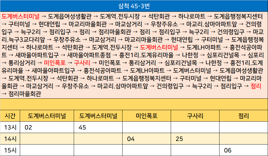 삼척 45-1번: 도계버스터미널 → 도계읍여성생활관 → 도계역.전두시장 → 석탄회관 → 하나로마트 → 도계읍행정복지센터 → 구터미널 → 현대연립 → 마교리마을회관 → 마교삼거리 → 우창주유소 → 마교리.삼마아파트앞 → 건의령입구 → 늑구2리 → 점리입구 → 점리 → 점리마을회관 → 점리 → 점리입구 → 늑구2리 → 건의령입구 → 마교리.늑구3교다리앞 → 우창주유소 → 마교삼거리 → 마교리마을회관 → 현대연립 → 구터미널 → 도계읍행정복지센터 → 하나로마트 → 석탄회관 → 도계역.전두시장 → 도계버스터미널 → 도계LH아파트 → 흥전석공아파트 → 새마을아파트입구 → 흥전1리.도계유리마을 → 나한정 → 심포리건널목 → 심포리 → 통리삼거리 → 미인폭포 → 구사리 → 신리너와마을 → 신리삼거리 → 신리너와민속유물 → 신리삼거리 → 신리너와마을 → 구사리 → 미인폭포 → 통리삼거리 → 심포리건널목 → 나한정 → 흥전1리.도계유리마을 → 새마을아파트입구 → 흥전석공아파트 → 도계LH아파트 → 도계버스터미널 → 도계역.전두시장 → 석탄회관 → 하나로마트 → 도계읍행정복지센터 → 하나로마트 → 석탄회관 → 도계역.전두시장 → 도계버스터미널