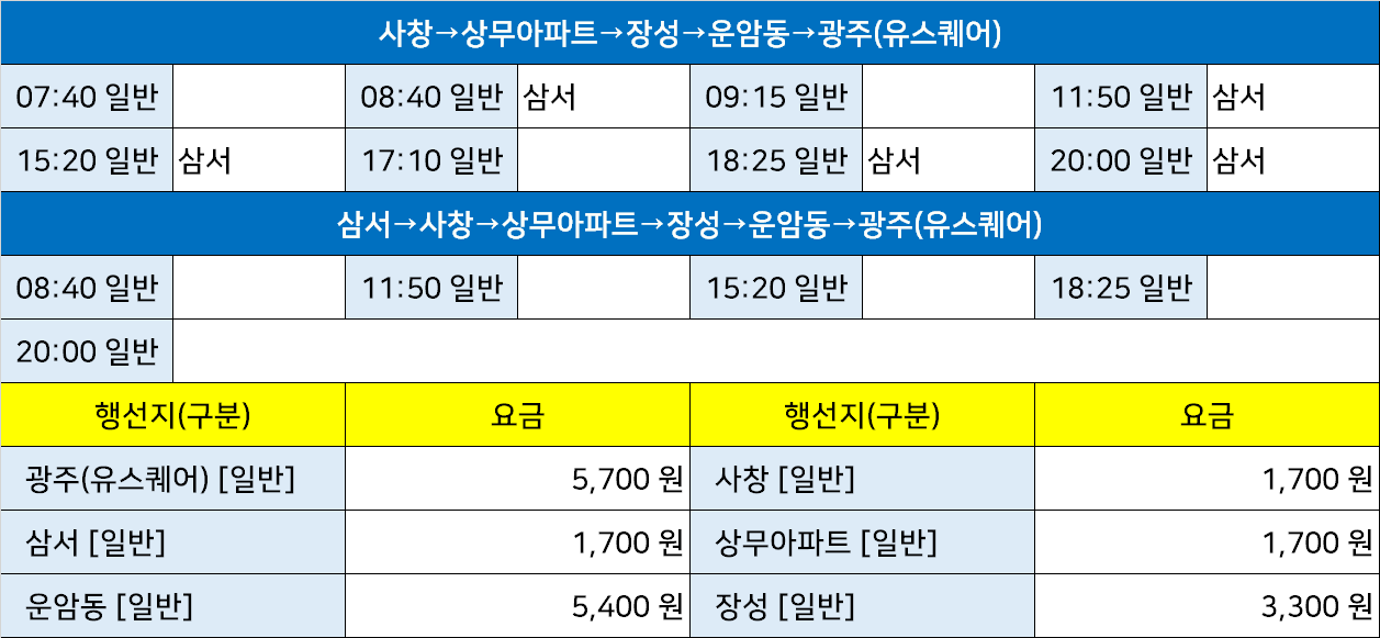상무대시외고속버스터미널 상무대정류소 상무대정류장 → "삼서→사창→상무아파트→장성→운암동→광주(유스퀘어)".