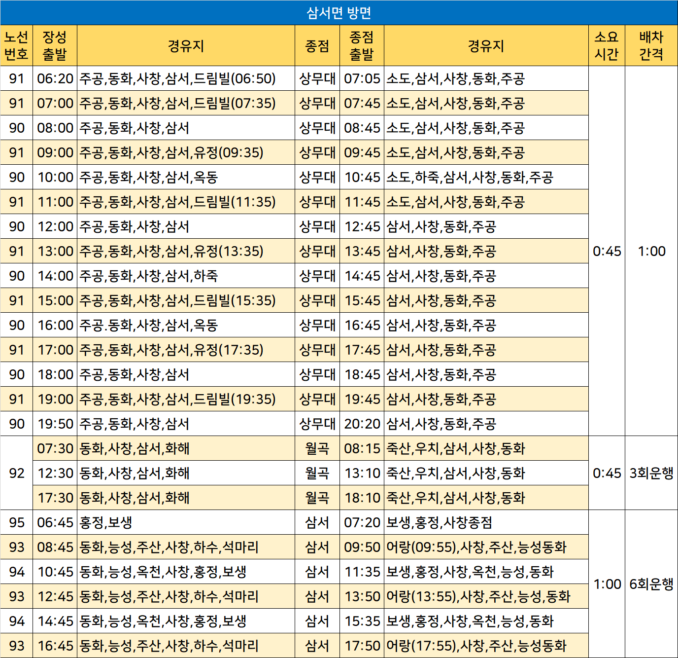삼서면 노선정보: 능성,동화,드림빌,보생,사창,삼서,상무대,석마리,소도,어랑,옥동,옥천,우치,월곡,유정,주공,주산,죽산,하수,하죽,홍정,화해