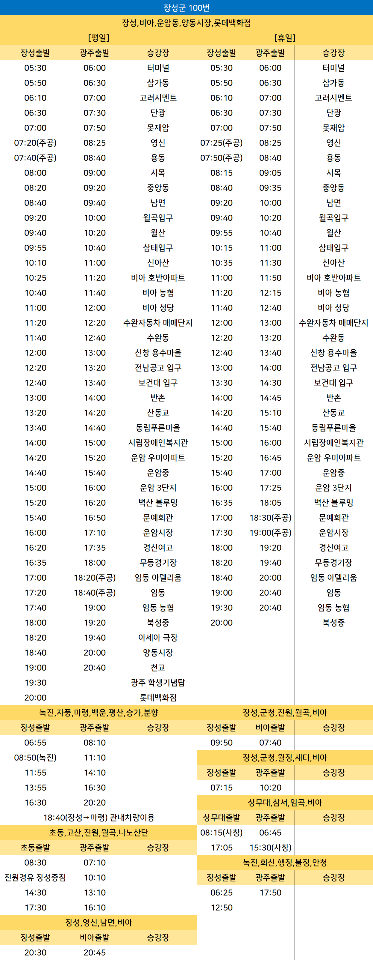 장성군 100번: 장성공용버스터미널 ↔ 남면로컬푸드 ↔ 남면사무소 ↔ 비아농협 ↔ 신창용수마을 ↔ 보건대입구 ↔ 산동교 ↔ 운암3단지 ↔ (← 금호중앙여교 ←) ↔ 경신여고 ↔ 무등경기장 ↔ 임동주민센터 ↔ (→ 북성중 → 광주은행북부지점 →/← 전남방직 ← 양동교 ←) ↔ 양동시장 ↔ 천교 ↔ 롯데백화점