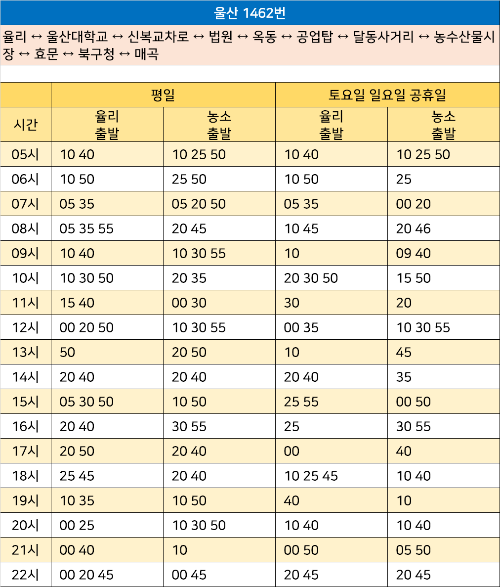 울산 1462번: 율리 ↔ 울산대학교 ↔ 신복교차로 ↔ 법원 ↔ 옥동 ↔ 공업탑 ↔ 달동사거리 ↔ 농수산물시장 ↔ 효문 ↔ 북구청 ↔ 매곡