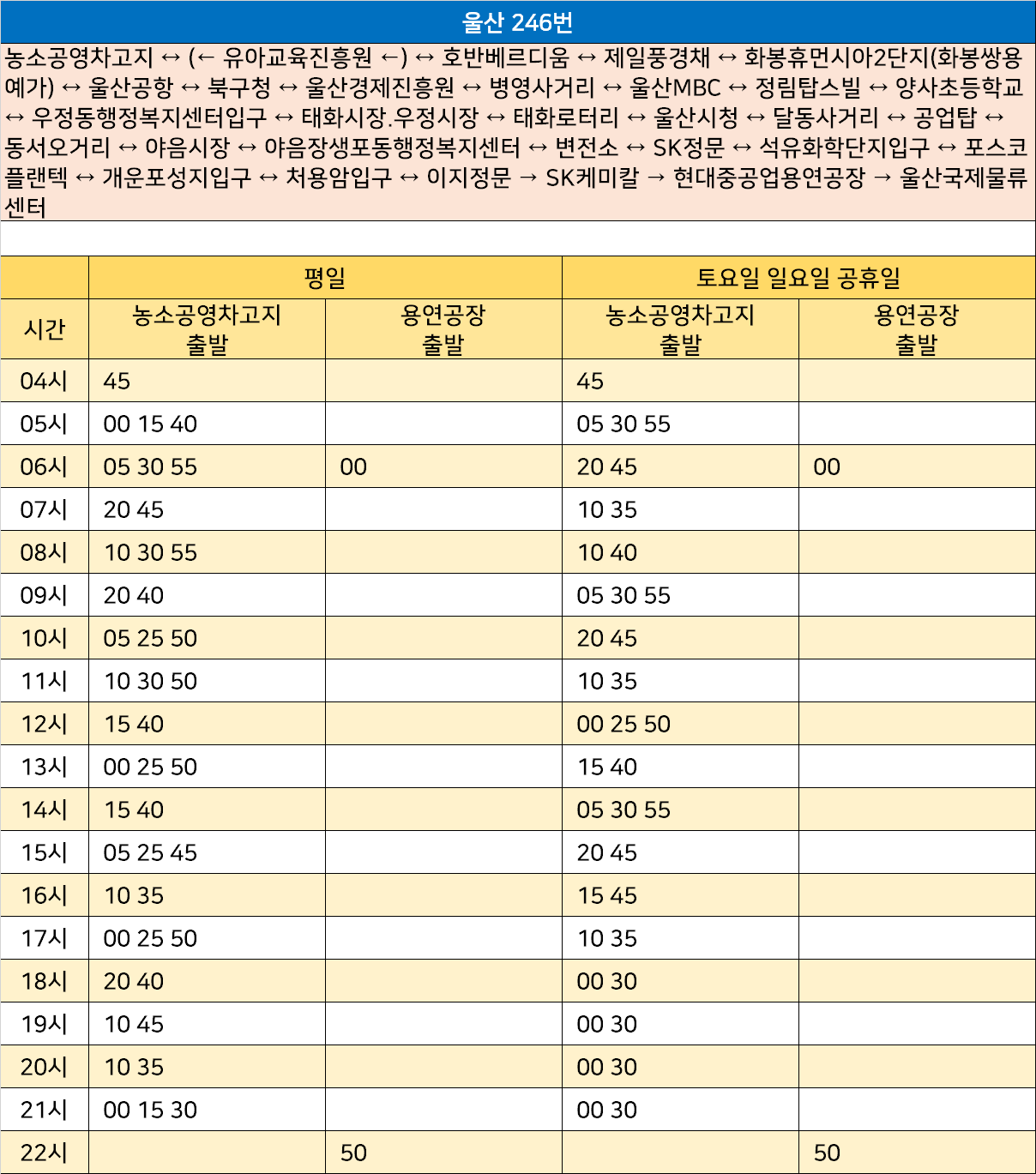 울산 246번: 농소공영차고지 ↔ (← 유아교육진흥원 ←) ↔ 호반베르디움 ↔ 제일풍경채 ↔ 화봉휴먼시아2단지(화봉쌍용예가) ↔ 울산공항 ↔ 북구청 ↔ 울산경제진흥원 ↔ 병영사거리 ↔ 울산MBC ↔ 정림탑스빌 ↔ 양사초등학교 ↔ 우정동행정복지센터입구 ↔ 태화시장.우정시장 ↔ 태화로터리 ↔ 울산시청 ↔ 달동사거리 ↔ 공업탑 ↔ 동서오거리 ↔ 야음시장 ↔ 야음장생포동행정복지센터 ↔ 변전소 ↔ SK정문 ↔ 석유화학단지입구 ↔ 포스코플랜텍 ↔ 개운포성지입구 ↔ 처용암입구 ↔ 이지정문 → SK케미칼 → 현대중공업용연공장 → 울산국제물류센터