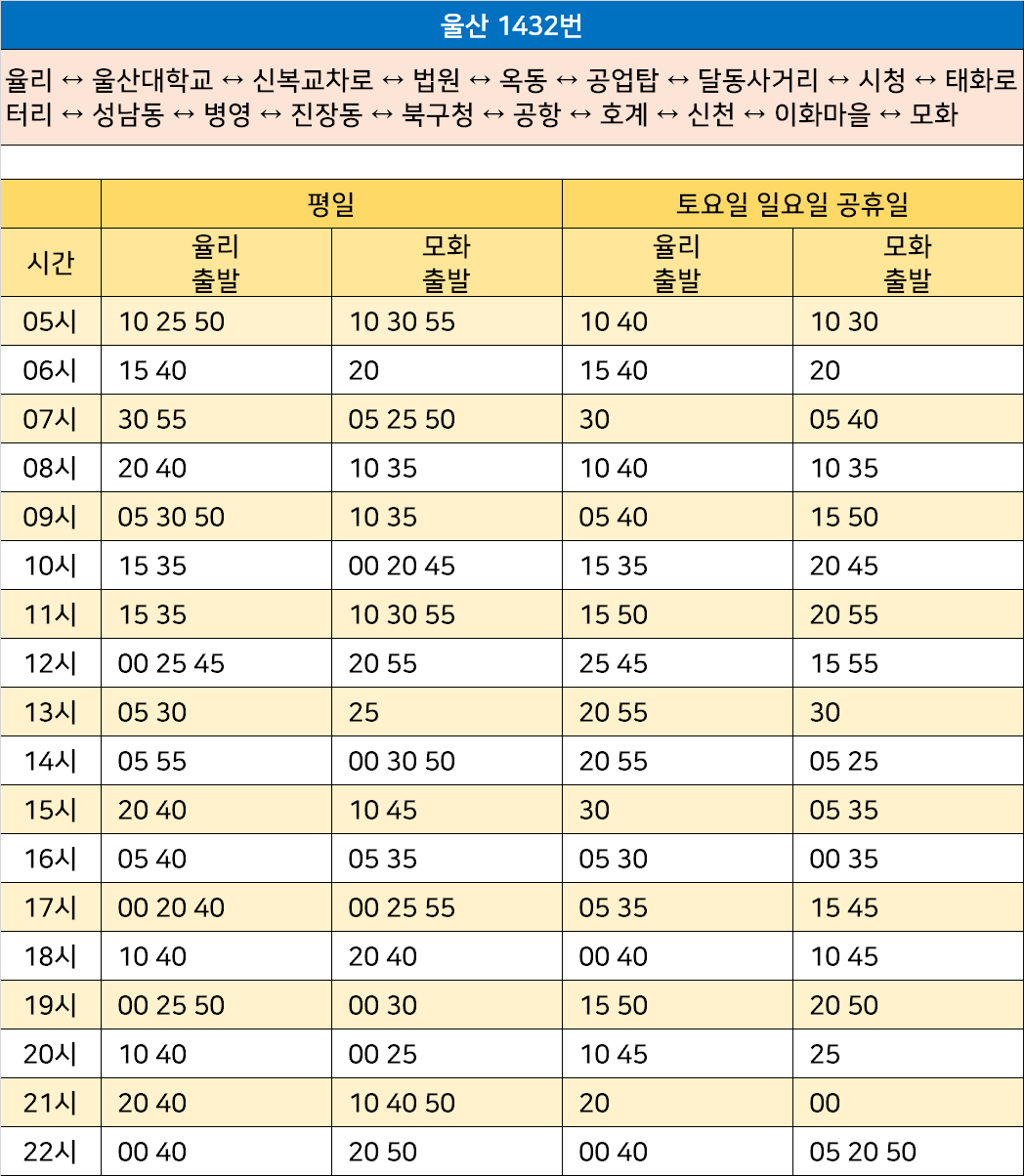 울산 1432번: 율리 ↔ 울산대학교 ↔ 신복교차로 ↔ 법원 ↔ 옥동 ↔ 공업탑 ↔ 달동사거리 ↔ 시청 ↔ 태화로터리 ↔ 성남동 ↔ 병영 ↔ 진장동 ↔ 북구청 ↔ 공항 ↔ 호계 ↔ 신천 ↔ 이화마을 ↔ 모화