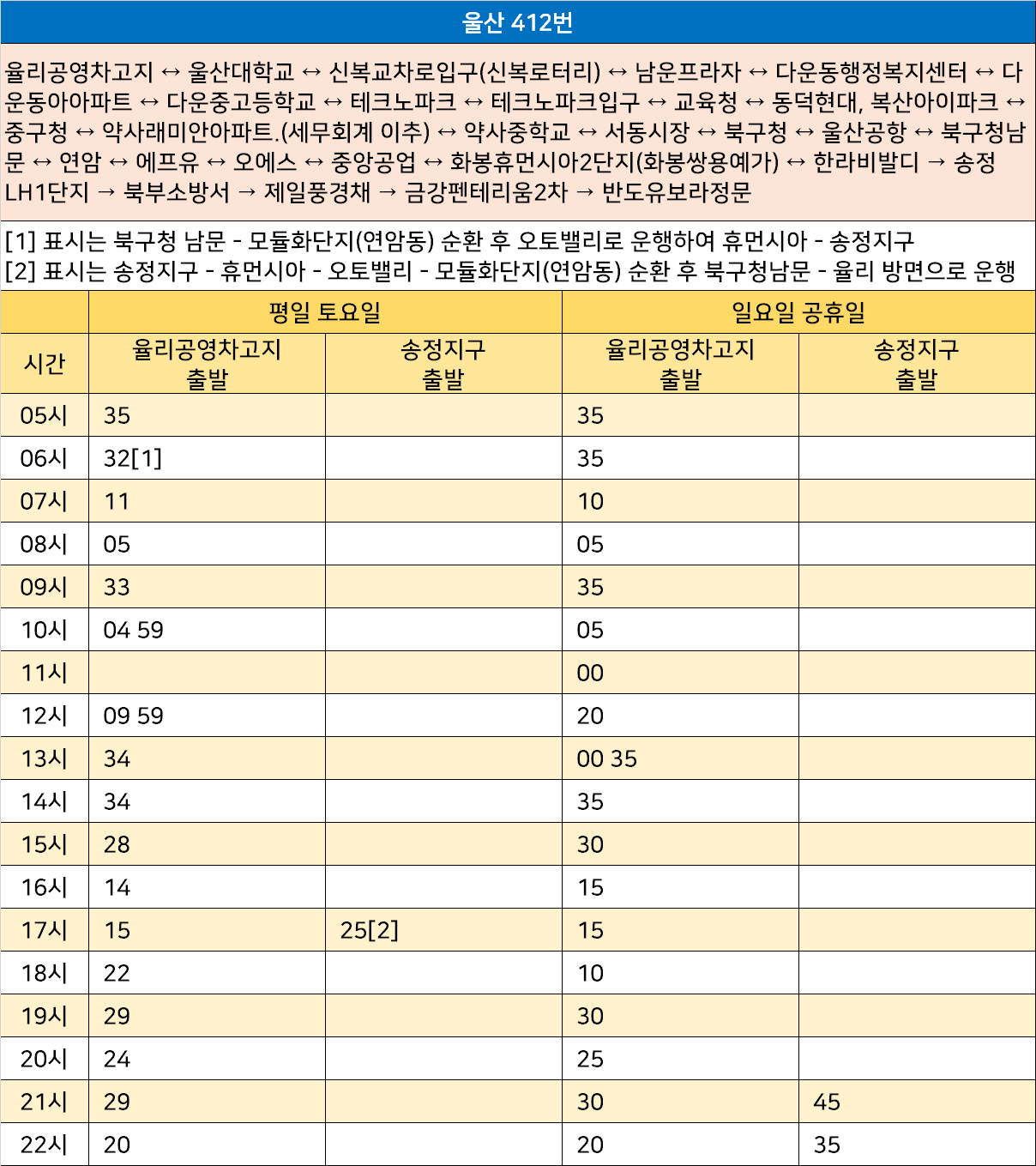 울산 412번: 율리공영차고지 ↔ 울산대학교 ↔ 신복교차로입구(신복로터리) ↔ 남운프라자 ↔ 다운동행정복지센터 ↔ 다운동아아파트 ↔ 다운중고등학교 ↔ 테크노파크 ↔ 테크노파크입구 ↔ 교육청 ↔ 동덕현대, 복산아이파크 ↔ 중구청 ↔ 약사래미안아파트.(세무회계 이추) ↔ 약사중학교 ↔ 서동시장 ↔ 북구청 ↔ 울산공항 ↔ 북구청남문 ↔ 연암 ↔ 에프유 ↔ 오에스 ↔ 중앙공업 ↔ 화봉휴먼시아2단지(화봉쌍용예가) ↔ 한라비발디 → 송정LH1단지 → 북부소방서 → 제일풍경채 → 금강펜테리움2차 → 반도유보라정문