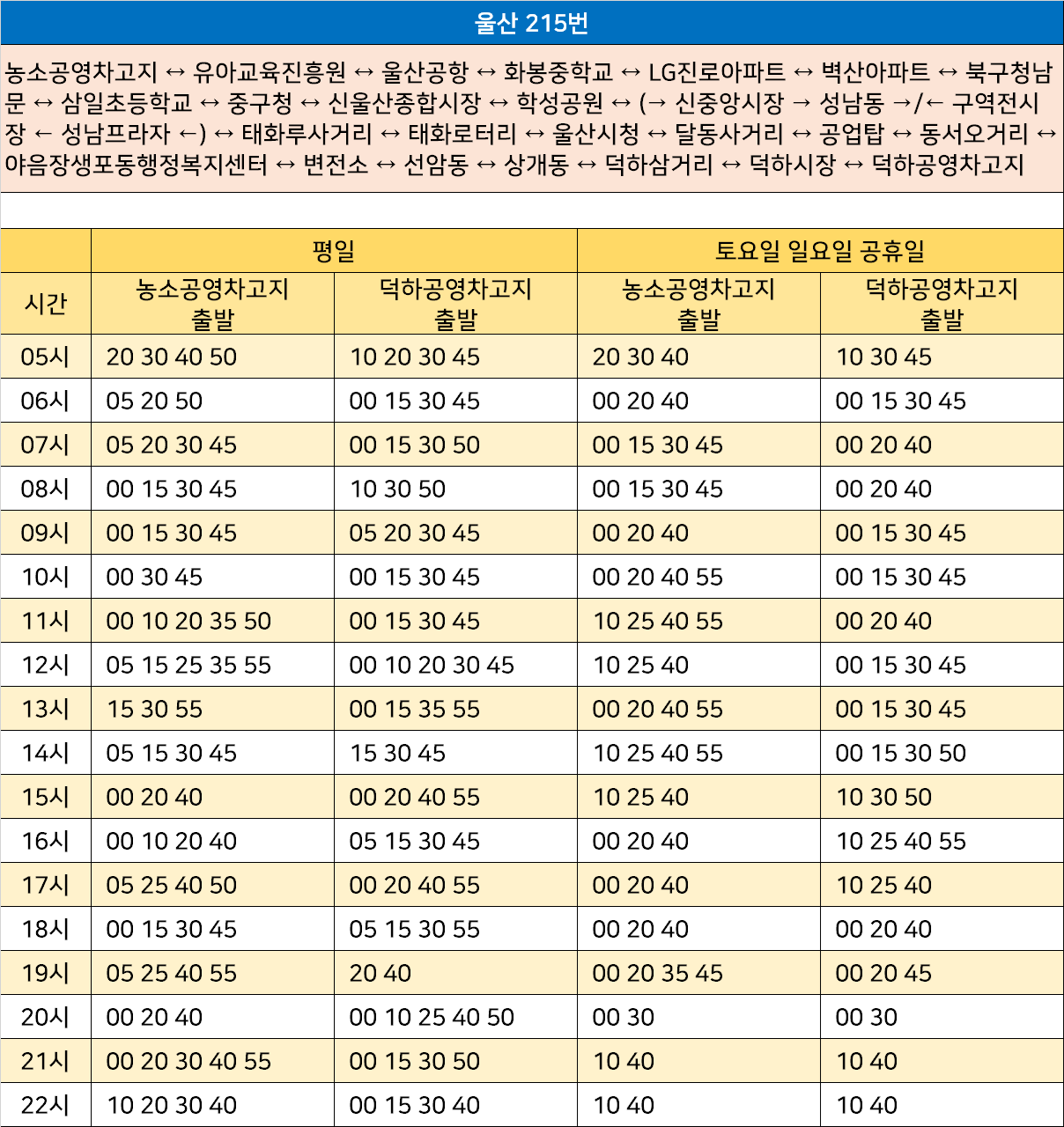 울산 215번: 농소공영차고지 ↔ 유아교육진흥원 ↔ 울산공항 ↔ 화봉중학교 ↔ LG진로아파트 ↔ 벽산아파트 ↔ 북구청남문 ↔ 삼일초등학교 ↔ 중구청 ↔ 신울산종합시장 ↔ 학성공원 ↔ (→ 신중앙시장 → 성남동 →/← 구역전시장 ← 성남프라자 ←) ↔ 태화루사거리 ↔ 태화로터리 ↔ 울산시청 ↔ 달동사거리 ↔ 공업탑 ↔ 동서오거리 ↔ 야음장생포동행정복지센터 ↔ 변전소 ↔ 선암동 ↔ 상개동 ↔ 덕하삼거리 ↔ 덕하시장 ↔ 덕하공영차고지