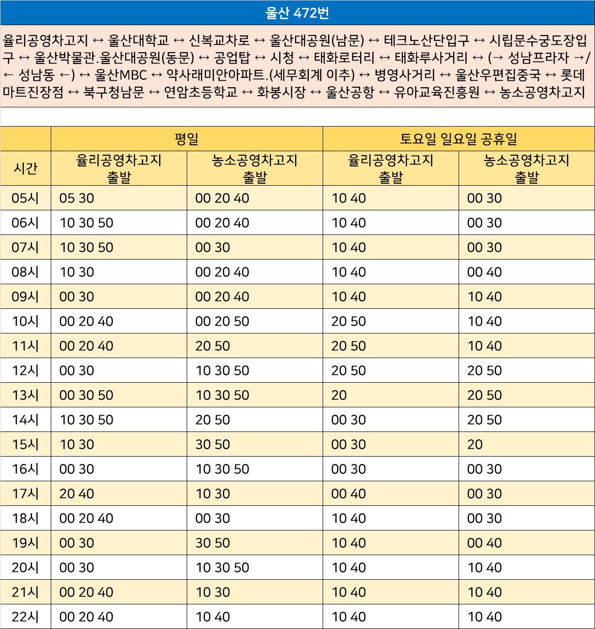 울산 472번: 율리공영차고지 ↔ 울산대학교 ↔ 신복교차로 ↔ 울산대공원(남문) ↔ 테크노산단입구 ↔ 시립문수궁도장입구 ↔ 울산박물관.울산대공원(동문) ↔ 공업탑 ↔ 시청 ↔ 태화로터리 ↔ 태화루사거리 ↔ (→ 성남프라자 →/← 성남동 ←) ↔ 울산MBC ↔ 약사래미안아파트.(세무회계 이추) ↔ 병영사거리 ↔ 울산우편집중국 ↔ 롯데마트진장점 ↔ 북구청남문 ↔ 연암초등학교 ↔ 화봉시장 ↔ 울산공항 ↔ 유아교육진흥원 ↔ 농소공영차고지