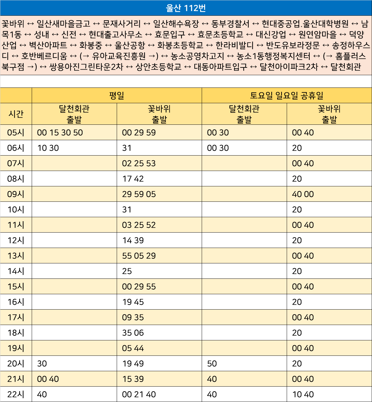 울산 112번: 꽃바위 ↔ 일산새마을금고 ↔ 문재사거리 ↔ 일산해수욕장 ↔ 동부경찰서 ↔ 현대중공업.울산대학병원 ↔ 남목1동 ↔ 성내 ↔ 신전 ↔ 현대출고사무소 ↔ 효문입구 ↔ 효문초등학교 ↔ 대신강업 ↔ 원연암마을 ↔ 덕양산업 ↔ 벽산아파트 ↔ 화봉중 ↔ 울산공항 ↔ 화봉초등학교 ↔ 한라비발디 ↔ 반도유보라정문 ↔ 송정하우스디 ↔ 호반베르디움 ↔ (→ 유아교육진흥원 →) ↔ 농소공영차고지 ↔ 농소1동행정복지센터 ↔ (→ 홈플러스북구점 →) ↔ 쌍용아진그린타운2차 ↔ 상안초등학교 ↔ 대동아파트입구 ↔ 달천아이파크2차 ↔ 달천회관