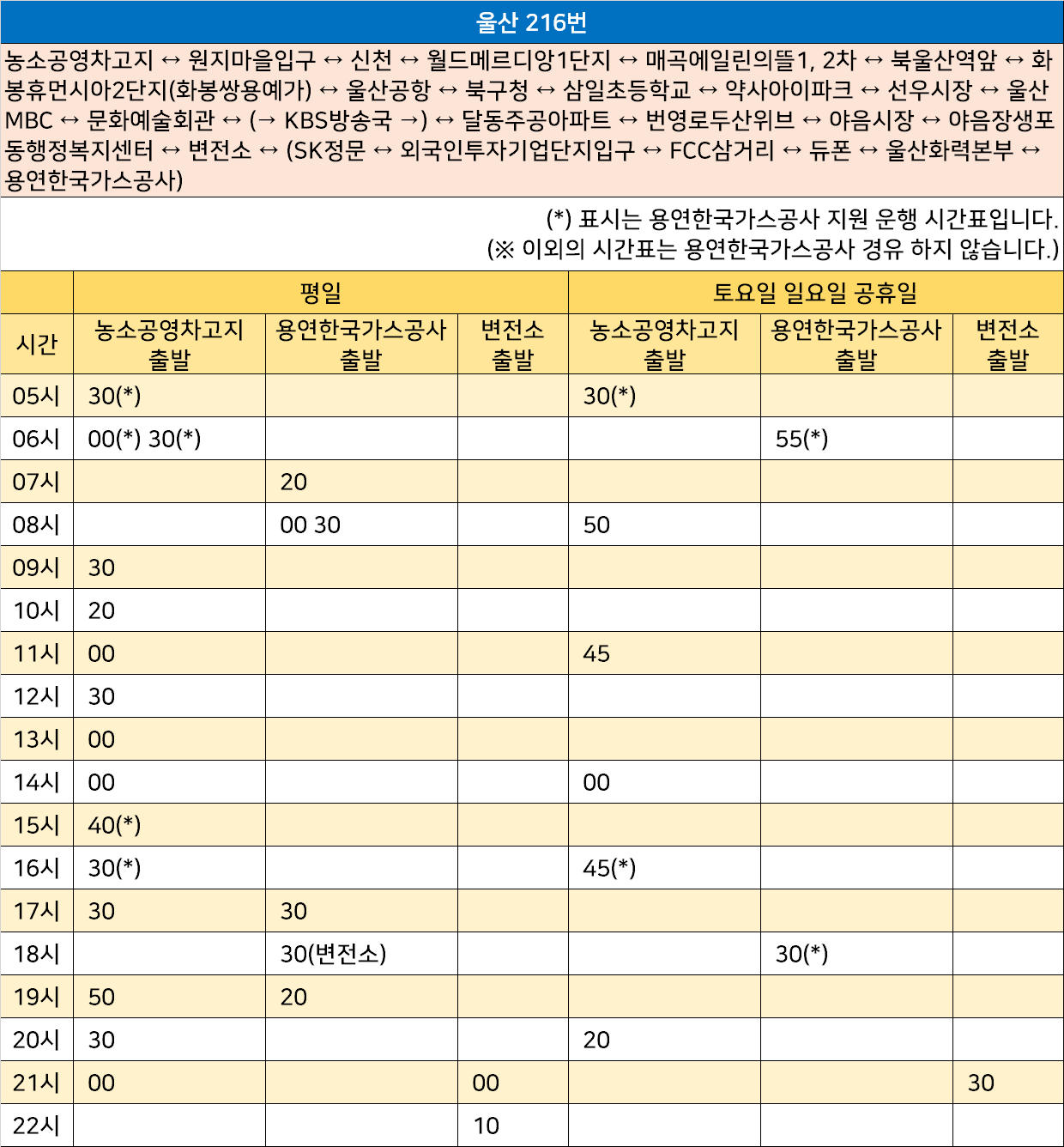 울산 216번: 농소공영차고지 ↔ 원지마을입구 ↔ 신천 ↔ 월드메르디앙1단지 ↔ 매곡에일린의뜰1, 2차 ↔ 북울산역앞 ↔ 화봉휴먼시아2단지(화봉쌍용예가) ↔ 울산공항 ↔ 북구청 ↔ 삼일초등학교 ↔ 약사아이파크 ↔ 선우시장 ↔ 울산MBC ↔ 문화예술회관 ↔ (→ KBS방송국 →) ↔ 달동주공아파트 ↔ 번영로두산위브 ↔ 야음시장 ↔ 야음장생포동행정복지센터 ↔ 변전소 ↔ (SK정문 ↔ 외국인투자기업단지입구 ↔ FCC삼거리 ↔ 듀폰 ↔ 울산화력본부 ↔ 용연한국가스공사)