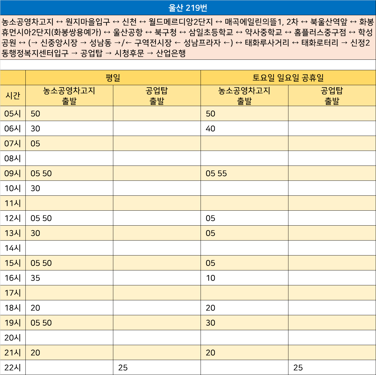 울산 219번: 농소공영차고지 ↔ 원지마을입구 ↔ 신천 ↔ 월드메르디앙2단지 ↔ 매곡에일린의뜰1, 2차 ↔ 북울산역앞 ↔ 화봉휴먼시아2단지(화봉쌍용예가) ↔ 울산공항 ↔ 북구청 ↔ 삼일초등학교 ↔ 약사중학교 ↔ 홈플러스중구점 ↔ 학성공원 ↔ (→ 신중앙시장 → 성남동 →/← 구역전시장 ← 성남프라자 ←) ↔ 태화루사거리 ↔ 태화로터리 → 신정2동행정복지센터입구 → 공업탑 → 시청후문 → 산업은행
