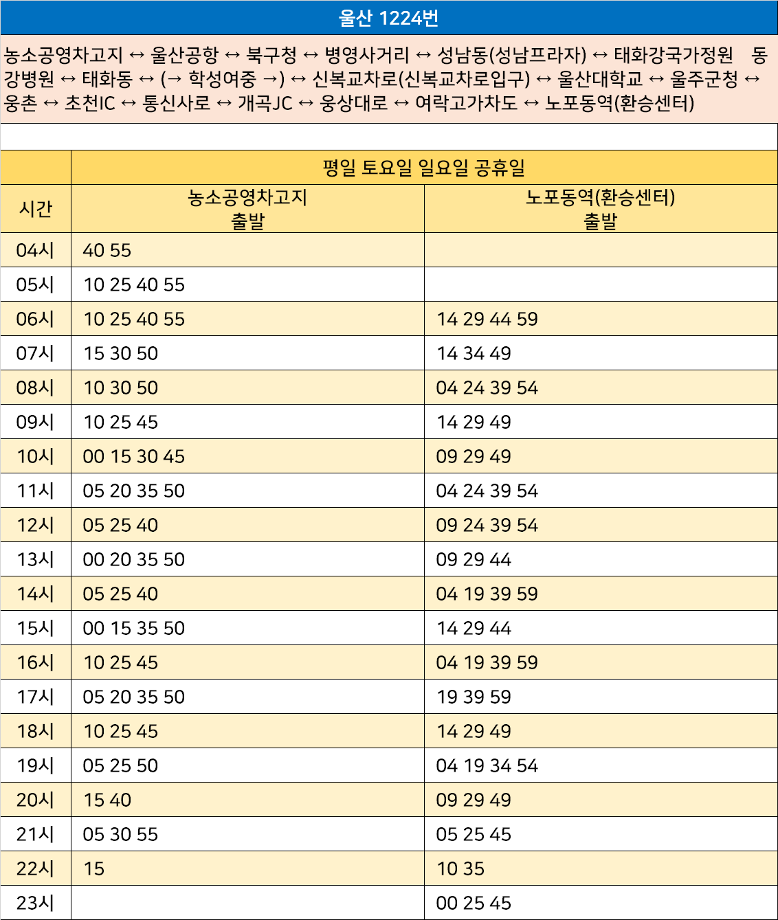 울산 1224번: 농소공영차고지 ↔ 울산공항 ↔ 북구청 ↔ 병영사거리 ↔ 성남동(성남프라자) ↔ 태화강국가정원•동강병원 ↔ 태화동 ↔ (→ 학성여중 →) ↔ 신복교차로(신복교차로입구) ↔ 울산대학교 ↔ 울주군청 ↔ 웅촌 ↔ 초천IC ↔ 통신사로 ↔ 개곡JC ↔ 웅상대로 ↔ 여락고가차도 ↔ 노포동역(환승센터)