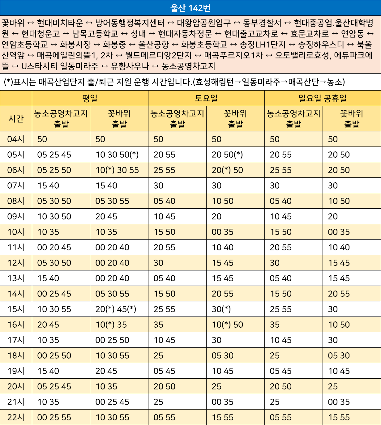 울산 142번: 꽃바위 ↔ 현대비치타운 ↔ 방어동행정복지센터 ↔ 대왕암공원입구 ↔ 동부경찰서 ↔ 현대중공업.울산대학병원 ↔ 현대청운고 ↔ 남목고등학교 ↔ 성내 ↔ 현대자동차정문 ↔ 현대출고교차로 ↔ 효문교차로 ↔ 연암동 ↔ 연암초등학교 ↔ 화봉시장 ↔ 화봉중 ↔ 울산공항 ↔ 화봉초등학교 ↔ 송정LH1단지 ↔ 송정하우스디 ↔ 북울산역앞 ↔ 매곡에일린의뜰1, 2차 ↔ 월드메르디앙2단지 ↔ 매곡푸르지오1차 ↔ 오토밸리로효성, 에듀파크에뜰 ↔ U스타시티 일동미라주 ↔ 유황사우나 ↔ 농소공영차고지