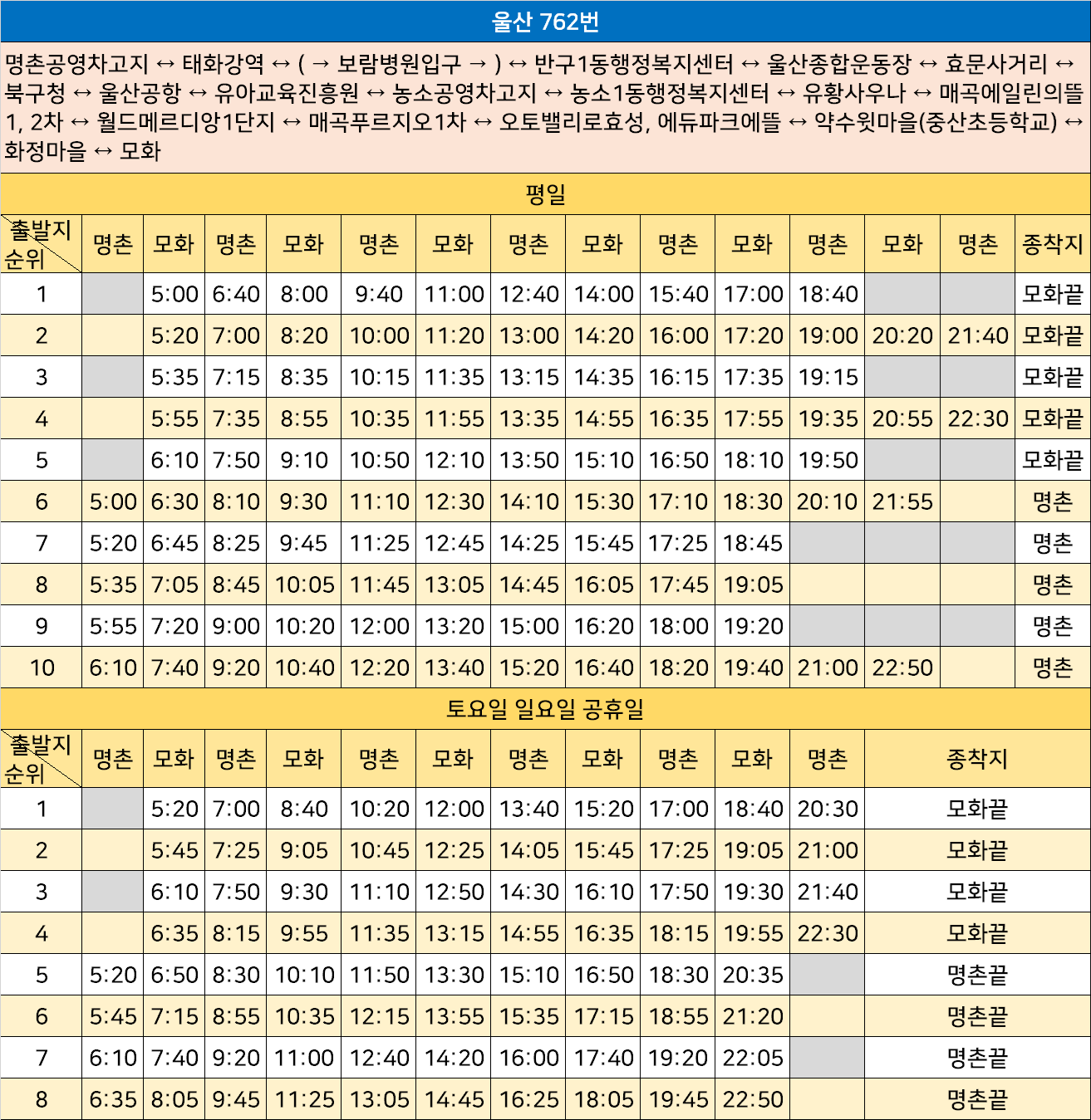 울산 762번: 명촌공영차고지 ↔ 태화강역 ↔ ( → 보람병원입구 → ) ↔ 반구1동행정복지센터 ↔ 울산종합운동장 ↔ 효문사거리 ↔ 북구청 ↔ 울산공항 ↔ 유아교육진흥원 ↔ 농소공영차고지 ↔ 농소1동행정복지센터 ↔ 유황사우나 ↔ 매곡에일린의뜰1, 2차 ↔ 월드메르디앙1단지 ↔ 매곡푸르지오1차 ↔ 오토밸리로효성, 에듀파크에뜰 ↔ 약수윗마을(중산초등학교) ↔ 화정마을 ↔ 모화