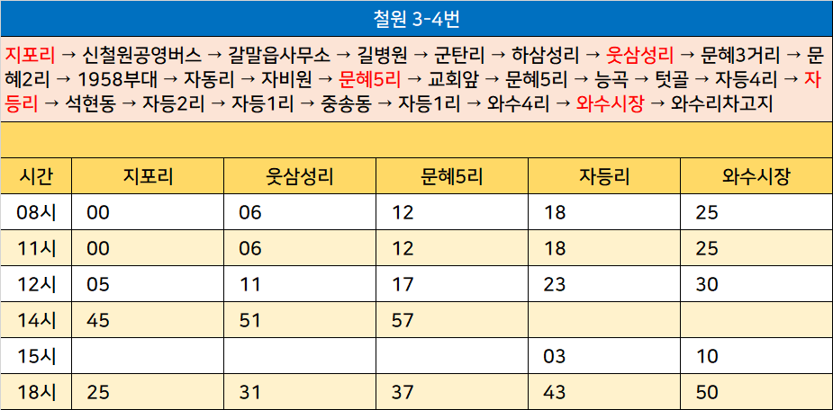 철원 3-4번: 지포리 → 신철원공영버스 → 갈말읍사무소 → 길병원 → 군탄리 → 하삼성리 → 웃삼성리 → 문혜3거리 → 문혜2리 → 1958부대 → 자동리 → 자비원 → 문혜5리 → 교회앞 → 문혜5리 → 능곡 → 텃골 → 자등4리 → 자등리 → 석현동 → 자등2리 → 자등1리 → 중송동 → 자등1리 → 와수4리 → 와수시장 → 와수리차고지