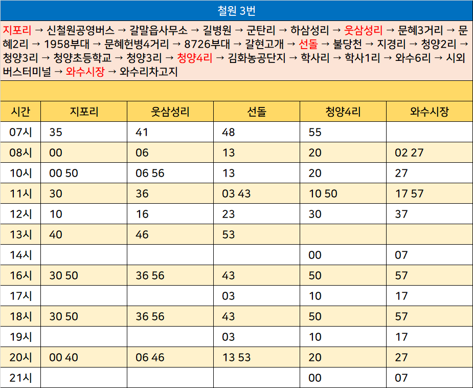 철원 3번: 지포리 → 신철원공영버스 → 갈말읍사무소 → 길병원 → 군탄리 → 하삼성리 → 웃삼성리 → 문혜3거리 → 문혜2리 → 1958부대 → 문혜헌병4거리 → 8726부대 → 갈현고개 → 선돌 → 불당천 → 지경리 → 청양2리 → 청양3리 → 청양초등학교 → 청양3리 → 청양4리 → 김화농공단지 → 학사리 → 학사1리 → 와수6리 → 시외버스터미널 → 와수시장 → 와수리차고지