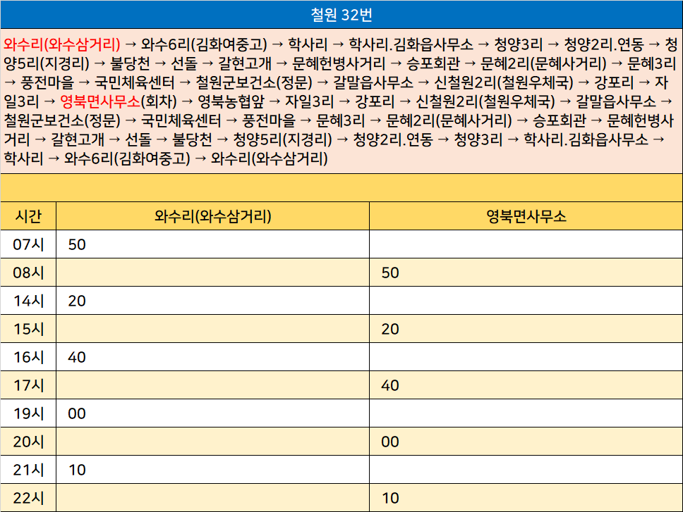 철원 32번: 와수리(와수삼거리) → 와수6리(김화여중고) → 학사리 → 학사리.김화읍사무소 → 청양3리 → 청양2리.연동 → 청양5리(지경리) → 불당천 → 선돌 → 갈현고개 → 문혜헌병사거리 → 승포회관 → 문혜2리(문혜사거리) → 문혜3리 → 풍전마을 → 국민체육센터 → 철원군보건소(정문) → 갈말읍사무소 → 신철원2리(철원우체국) → 강포리 → 자일3리 → 영북면사무소(회차) → 영북농협앞 → 자일3리 → 강포리 → 신철원2리(철원우체국) → 갈말읍사무소 → 철원군보건소(정문) → 국민체육센터 → 풍전마을 → 문혜3리 → 문혜2리(문혜사거리) → 승포회관 → 문혜헌병사거리 → 갈현고개 → 선돌 → 불당천 → 청양5리(지경리) → 청양2리.연동 → 청양3리 → 학사리.김화읍사무소 → 학사리 → 와수6리(김화여중고) → 와수리(와수삼거리)