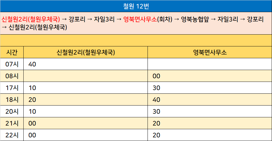 철원 12번: 신철원2리(철원우체국) → 강포리 → 자일3리 → 영북면사무소(회차) → 영북농협앞 → 자일3리 → 강포리 → 신철원2리(철원우체국)