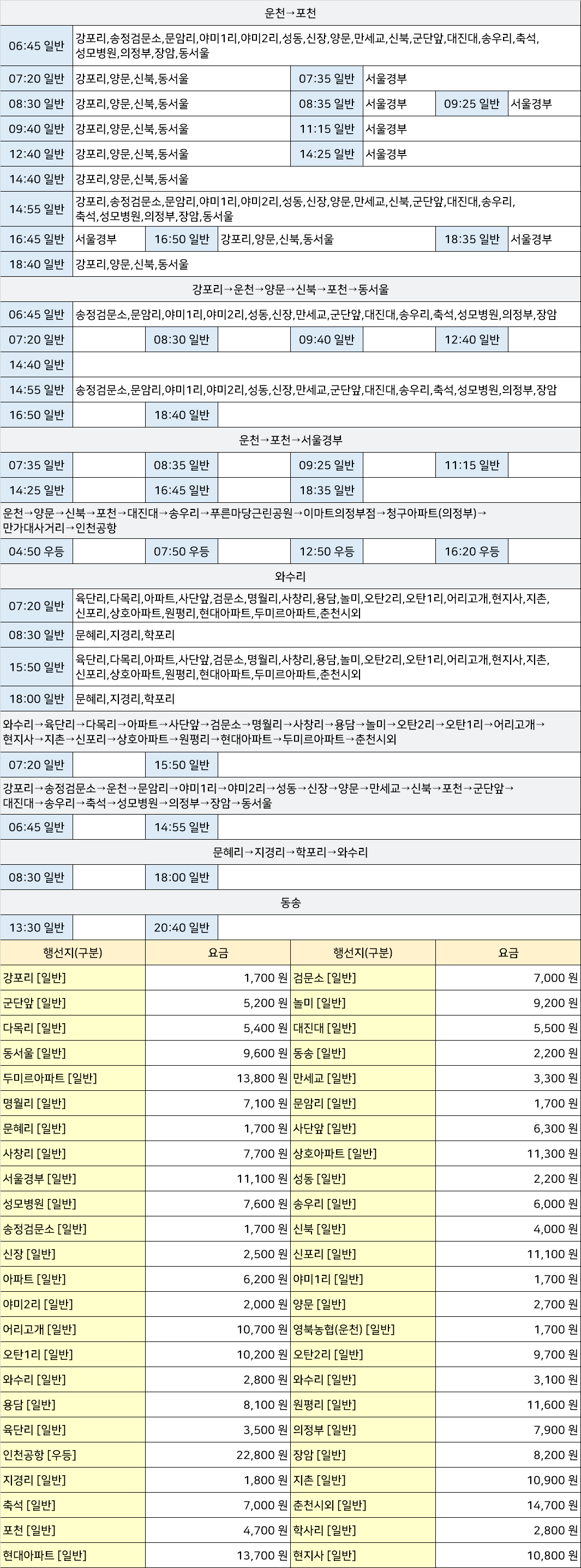 신철원시외고속버스터미널 신철원정류장 신철원정류소 → "강포리→송정검문소→운천→문암리→야미1리→야미2리→성동→신장→양문→만세교→신북→포천→군단앞→대진대→송우리→축석→성모병원→의정부→장암→동서울,강포리→운천→양문→신북→포천→동서울,동송,문혜리→지경리→학포리→와수리,와수리→육단리→다목리→아파트→사단앞→검문소→명월리→사창리→용담→놀미→오탄2리→오탄1리→어리고개→현지사→지촌→신포리→상호아파트→원평리→현대아파트→두미르아파트→춘천시외,운천→양문→신북→포천→대진대→송우리→푸른마당근린공원→이마트의정부점→청구아파트(의정부)→만가대사거리→인천공항,운천→포천→서울경부".