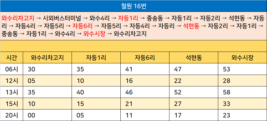철원 16번: 와수리차고지 → 시외버스터미널 → 와수4리 → 자등1리 → 중송동 → 자등1리 → 자등2리 → 석현동 → 자등리 → 자등4리 → 자등5리 → 자등6리 → 자등5리 → 자등4리 → 자등리 → 석현동 → 자등2리 → 자등1리 → 중송동 → 자등1리 → 와수4리 → 와수시장 → 와수리차고지