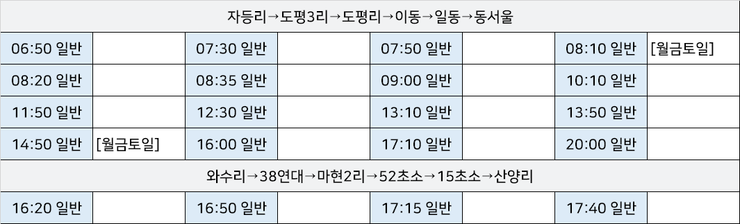 신수리시외고속버스터미널 신수리정류장 신수리정류소 → "와수리→38연대→마현2리→52초소→15초소→산양리,자등리→도평3리→도평리→이동→일동→동서울".
