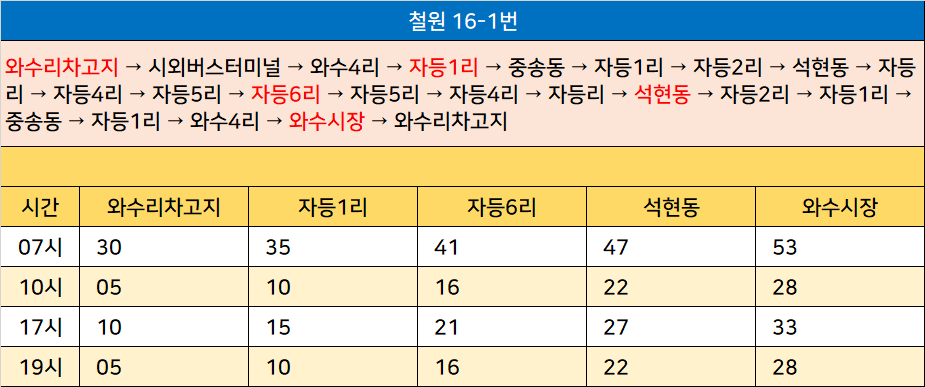 철원 16-1번: 와수리차고지 → 시외버스터미널 → 와수4리 → 자등1리 → 중송동 → 자등1리 → 자등2리 → 석현동 → 자등리 → 자등4리 → 자등5리 → 자등6리 → 자등5리 → 자등4리 → 자등리 → 석현동 → 자등2리 → 자등1리 → 중송동 → 자등1리 → 와수4리 → 와수시장 → 와수리차고지