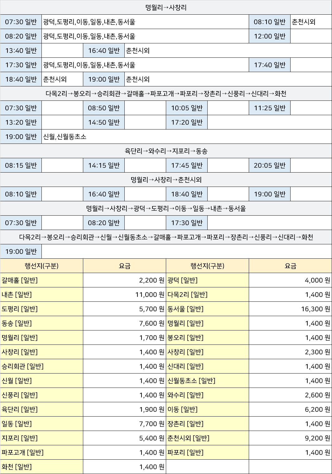 다목리 시외버스 터미널 시간표/요금표 2025년 05월 25일 기준