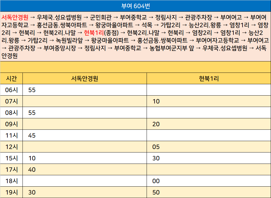 부여 604번: 서독안경원 → 우체국.성요셉병원 → 군민회관 → 부여중학교 → 정림사지 → 관광주차장 → 부여여고 → 부여여자고등학교 → 홍선금동.쌍북아파트 → 왕궁마을아파트 → 석목 → 가탑2리 → 능산2리.왕릉 → 염창1리 → 염창2리 → 현북리 → 현북2리.나말 → 현북1리(종점) → 현북2리.나말 → 현북리 → 염창2리 → 염창1리 → 능산2리.왕릉 → 가탑2리 → 녹원빌라앞 → 왕궁마을아파트 → 홍선금동.쌍북아파트 → 부여여자고등학교 → 부여여고 → 관광주차장 → 부여중앙시장 → 정림사지 → 부여중학교 → 농협부여군지부 앞 → 우체국.성요셉병원 → 서독안경원