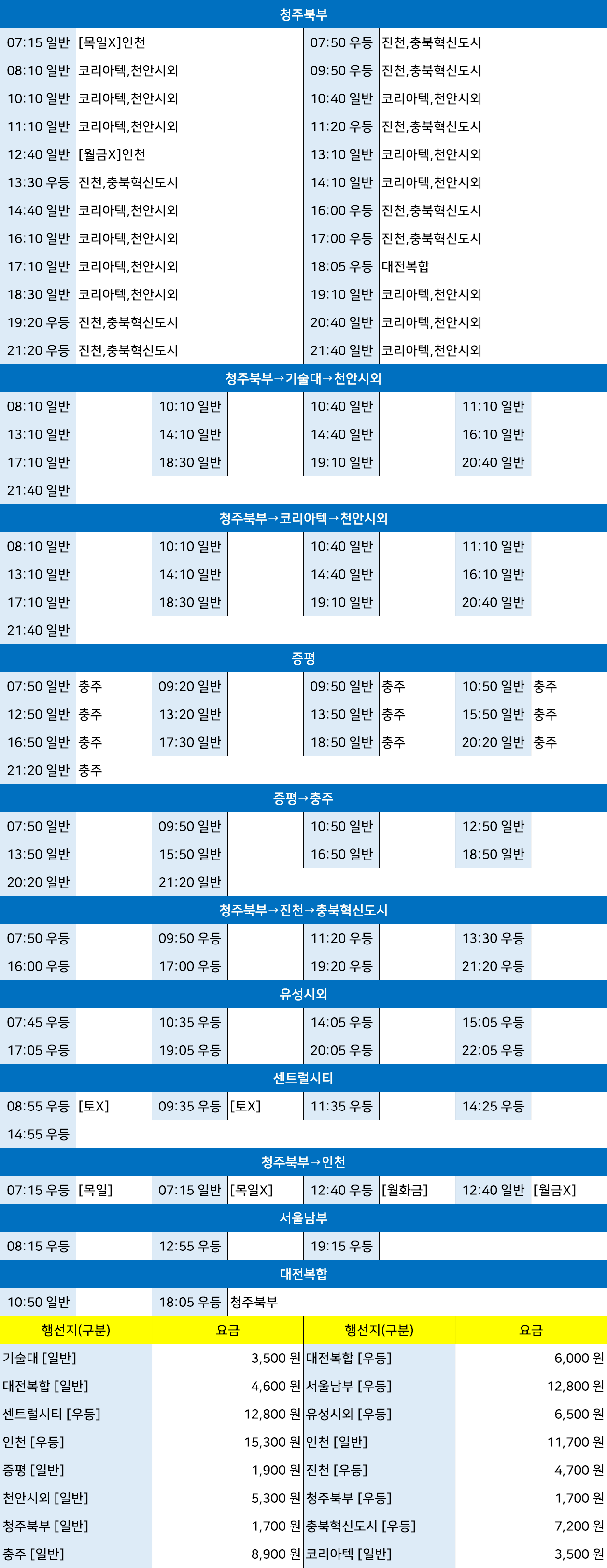 청주공항 시외버스 정류장 시간표/요금표 2025년 03월 04일 기준