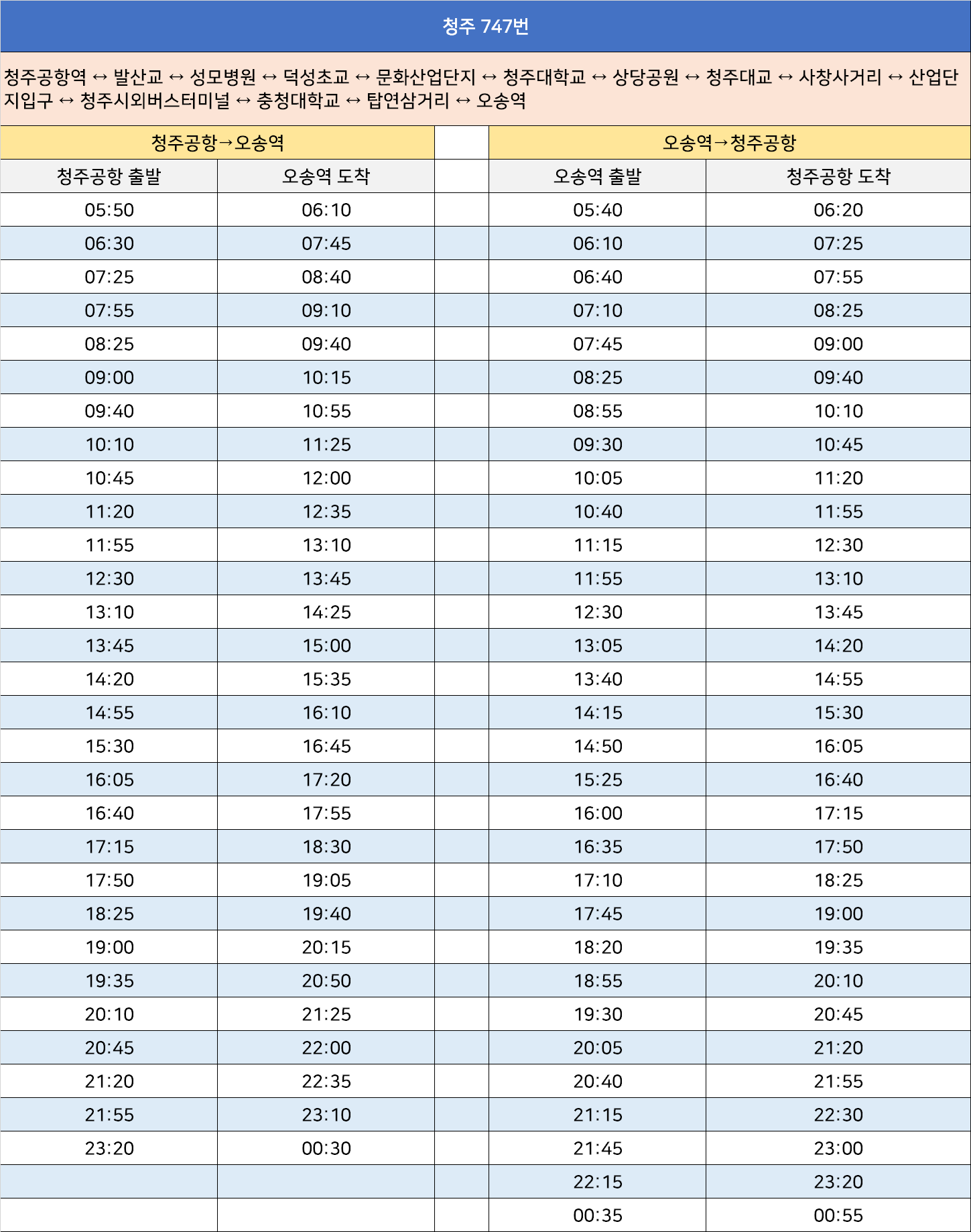 청주 747번: 청주공항역 ↔ 발산교 ↔ 성모병원 ↔ 덕성초교 ↔ 문화산업단지 ↔ 청주대학교 ↔ 상당공원 ↔ 청주대교 ↔ 사창사거리 ↔ 산업단지입구 ↔ 청주시외버스터미널 ↔ 충청대학교 ↔ 탑연삼거리 ↔ 오송역