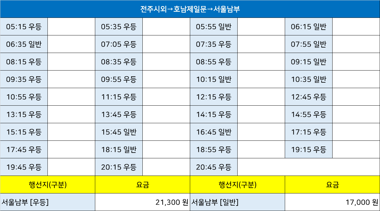 장신대시외고속버스정류장 장신대정류소 장신대터미널 → "전주시외→호남제일문→서울남부".