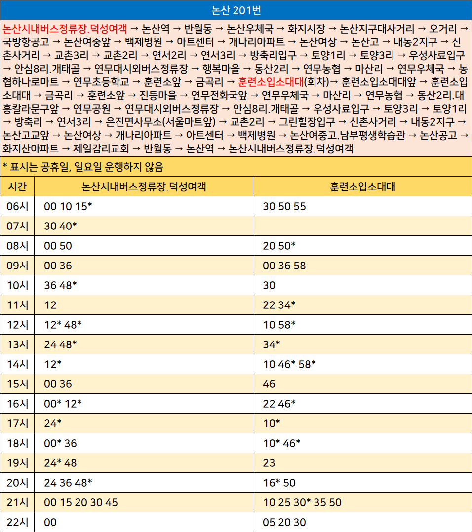 논산 201번: 논산시내버스정류장.덕성여객 → 논산역 → 반월동 → 논산우체국 → 화지시장 → 논산지구대사거리 → 오거리 → 국방항공고 → 논산여중앞 → 백제병원 → 아트센터 → 개나리아파트 → 논산여상 → 논산고 → 내동2지구 → 신촌사거리 → 교촌3리 → 교촌2리 → 연서2리 → 연서3리 → 방축리입구 → 토양1리 → 토양3리 → 우성사료입구 → 안심8리.개태골 → 연무대시외버스정류장 → 행복마을 → 동산2리 → 연무농협 → 마산리 → 연무우체국 → 농협하나로마트 → 연무초등학교 → 훈련소앞 → 금곡리 → 훈련소입소대대(회차)→ 훈련소입소대대앞 → 훈련소입소대대 → 금곡리 → 훈련소앞 → 진등마을 → 연무전화국앞 → 연무우체국 → 마산리 → 연무농협 → 동산2리.대흥칼라문구앞 → 연무공원 → 연무대시외버스정류장 → 안심8리.개태골 → 우성사료입구 → 토양3리 → 토양1리 → 방축리 → 연서3리 → 은진면사무소(서울마트앞) → 교촌2리 → 그린힐장입구 → 신촌사거리 → 내동2지구 → 논산고교앞 → 논산여상 → 개나리아파트 → 아트센터 → 백제병원 → 논산여중고.남부평생학습관 → 논산공고 → 화지산아파트 → 제일감리교회 → 반월동 → 논산역 → 논산시내버스정류장.덕성여객