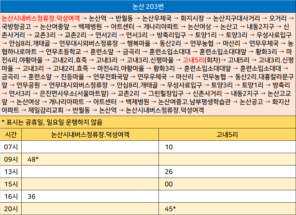 논산 203번: 논산시내버스정류장.덕성여객 → 논산역 → 반월동 → 논산우체국 → 화지시장 → 논산지구대사거리 → 오거리 → 국방항공고 → 논산여중앞 → 백제병원 → 아트센터 → 개나리아파트 → 논산여상 → 논산고 → 내동2지구 → 신촌사거리 → 교촌3리 → 교촌2리 → 연서2리 → 연서3리 → 방축리입구 → 토양1리 → 토양3리 → 우성사료입구 → 안심8리.개태골 → 연무대시외버스정류장 → 행복마을 → 동산2리 → 연무농협 → 마산리 → 연무우체국 → 농협하나로마트 → 연무초등학교 → 훈련소앞 → 금곡리 → 훈련소입소대대 → 훈련소입소대대앞 → 황화3리 → 마전4리.야황마을 → 고내2리.효죽 → 고내3리 → 고내3리.신평마을 → 고내5리(회차)→ 고내5리 → 고내3리.신평마을 → 고내3리 → 고내2리.효죽 → 마전4리.야황마을 → 황화3리 → 훈련소입소대대앞 → 훈련소입소대대 → 금곡리 → 훈련소앞 → 진등마을 → 연무전화국앞 → 연무우체국 → 마산리 → 연무농협 → 동산2리.대흥칼라문구앞 → 연무공원 → 연무대시외버스정류장 → 안심8리.개태골 → 우성사료입구 → 토양3리 → 토양1리 → 방축리 → 연서3리 → 은진면사무소(서울마트앞) → 교촌2리 → 그린힐장입구 → 신촌사거리 → 내동2지구 → 논산고교앞 → 논산여상 → 개나리아파트 → 아트센터 → 백제병원 → 논산여중고.남부평생학습관 → 논산공고 → 화지산아파트 → 제일감리교회 → 반월동 → 논산역 → 논산시내버스정류장.덕성여객