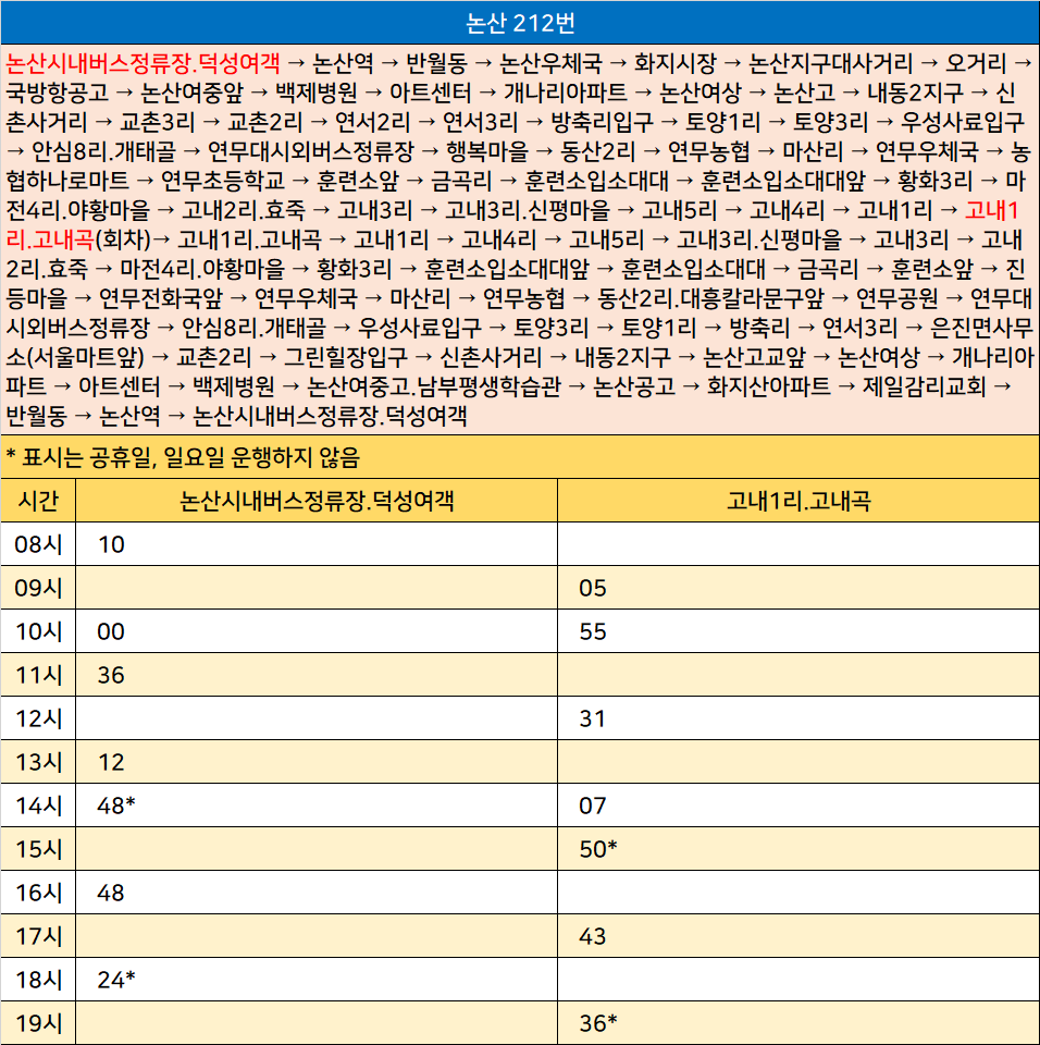 논산 212번: 논산시내버스정류장.덕성여객 → 논산역 → 반월동 → 논산우체국 → 화지시장 → 논산지구대사거리 → 오거리 → 국방항공고 → 논산여중앞 → 백제병원 → 아트센터 → 개나리아파트 → 논산여상 → 논산고 → 내동2지구 → 신촌사거리 → 교촌3리 → 교촌2리 → 연서2리 → 연서3리 → 방축리입구 → 토양1리 → 토양3리 → 우성사료입구 → 안심8리.개태골 → 연무대시외버스정류장 → 행복마을 → 동산2리 → 연무농협 → 마산리 → 연무우체국 → 농협하나로마트 → 연무초등학교 → 훈련소앞 → 금곡리 → 훈련소입소대대 → 훈련소입소대대앞 → 황화3리 → 마전4리.야황마을 → 고내2리.효죽 → 고내3리 → 고내3리.신평마을 → 고내5리 → 고내4리 → 고내1리 → 고내1리.고내곡(회차)→ 고내1리.고내곡 → 고내1리 → 고내4리 → 고내5리 → 고내3리.신평마을 → 고내3리 → 고내2리.효죽 → 마전4리.야황마을 → 황화3리 → 훈련소입소대대앞 → 훈련소입소대대 → 금곡리 → 훈련소앞 → 진등마을 → 연무전화국앞 → 연무우체국 → 마산리 → 연무농협 → 동산2리.대흥칼라문구앞 → 연무공원 → 연무대시외버스정류장 → 안심8리.개태골 → 우성사료입구 → 토양3리 → 토양1리 → 방축리 → 연서3리 → 은진면사무소(서울마트앞) → 교촌2리 → 그린힐장입구 → 신촌사거리 → 내동2지구 → 논산고교앞 → 논산여상 → 개나리아파트 → 아트센터 → 백제병원 → 논산여중고.남부평생학습관 → 논산공고 → 화지산아파트 → 제일감리교회 → 반월동 → 논산역 → 논산시내버스정류장.덕성여객