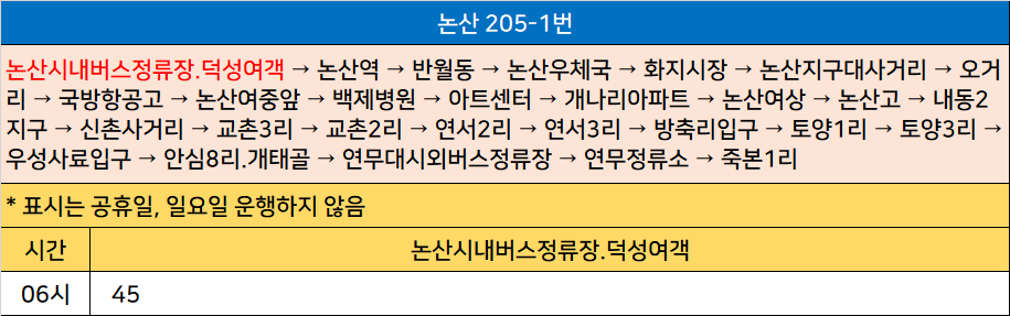 논산 205-1번: 논산시내버스정류장.덕성여객 → 논산역 → 반월동 → 논산우체국 → 화지시장 → 논산지구대사거리 → 오거리 → 국방항공고 → 논산여중앞 → 백제병원 → 아트센터 → 개나리아파트 → 논산여상 → 논산고 → 내동2지구 → 신촌사거리 → 교촌3리 → 교촌2리 → 연서2리 → 연서3리 → 방축리입구 → 토양1리 → 토양3리 → 우성사료입구 → 안심8리.개태골 → 연무대시외버스정류장 → 연무정류소 → 죽본1리